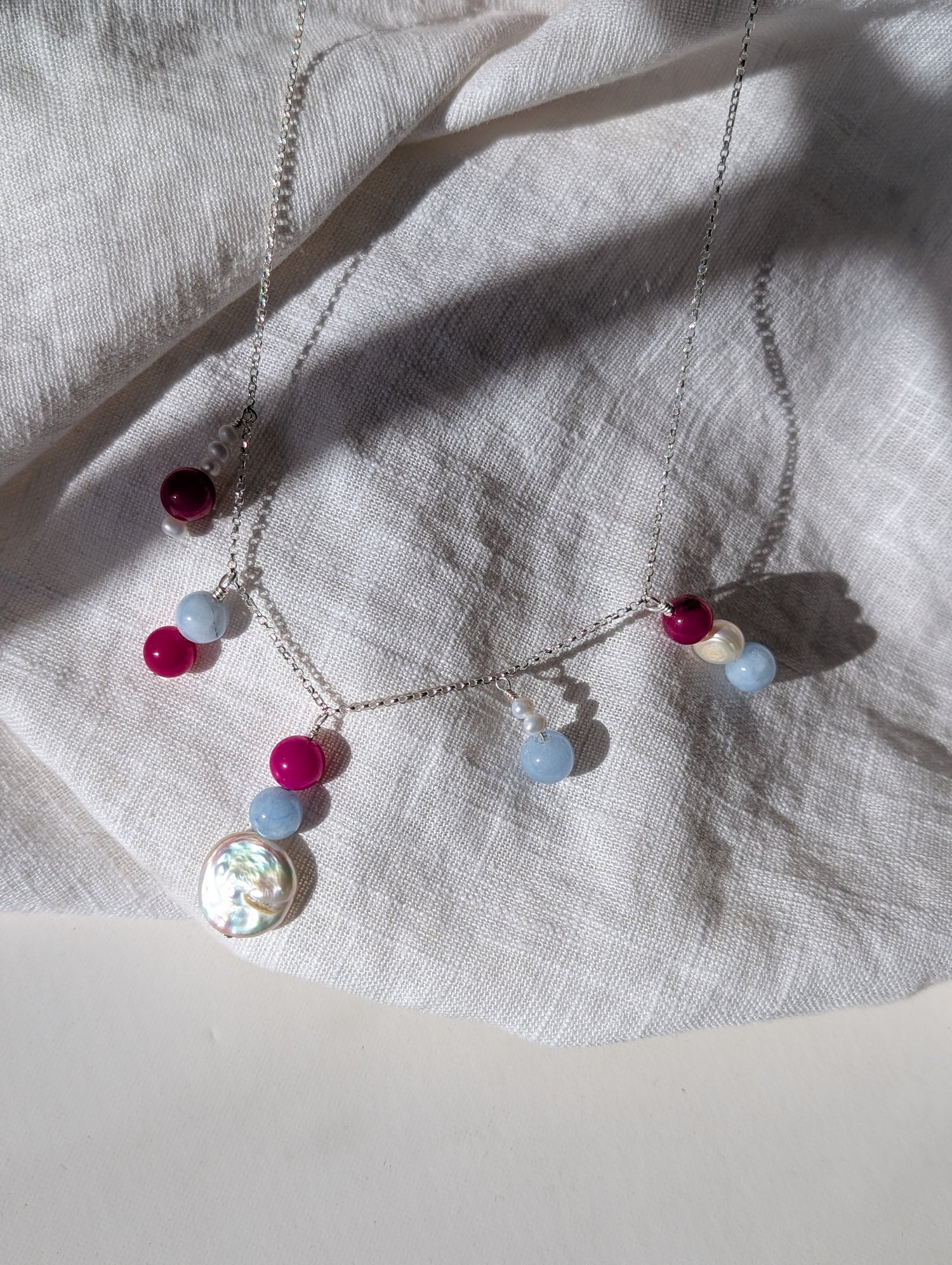 Our multi crystal and pearl charm necklaces add a pop of colour to a classic look. Each one is different with a combination of bright pink and pale blue crystals with ivory pearls. Each one is one of a kind just like you.