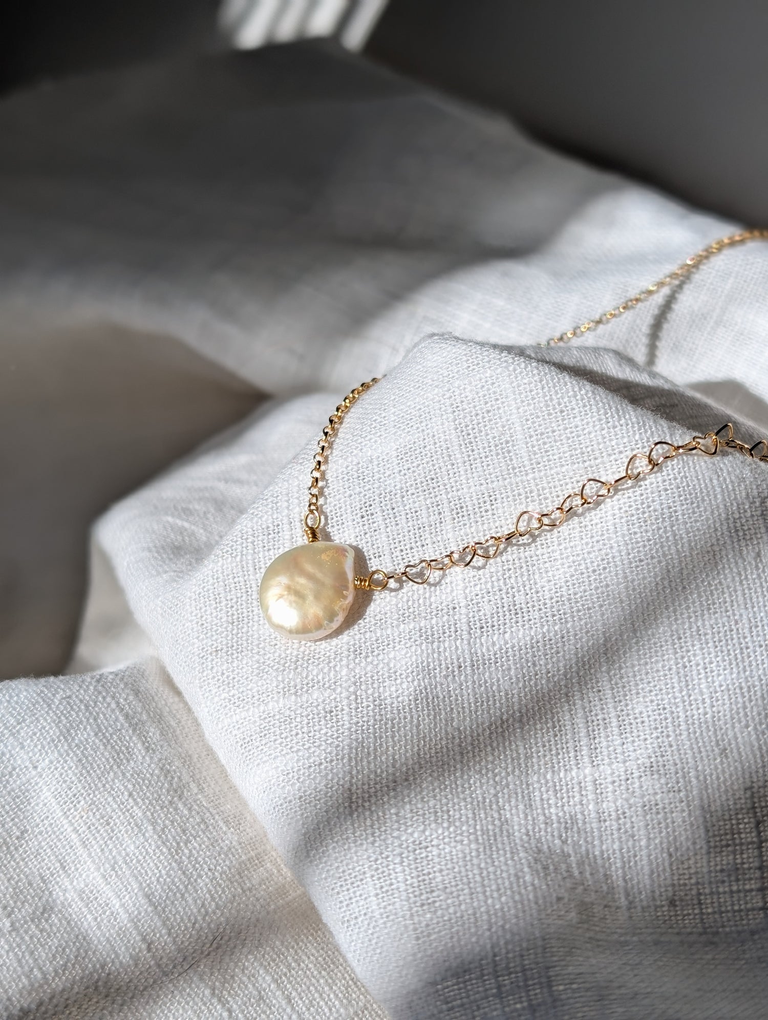 Hlone side of our gorgeous coin pearl has a beautiful chunky belcher chain and the other is our delicate heart chain. The cutest way to add a little light to your outfit!