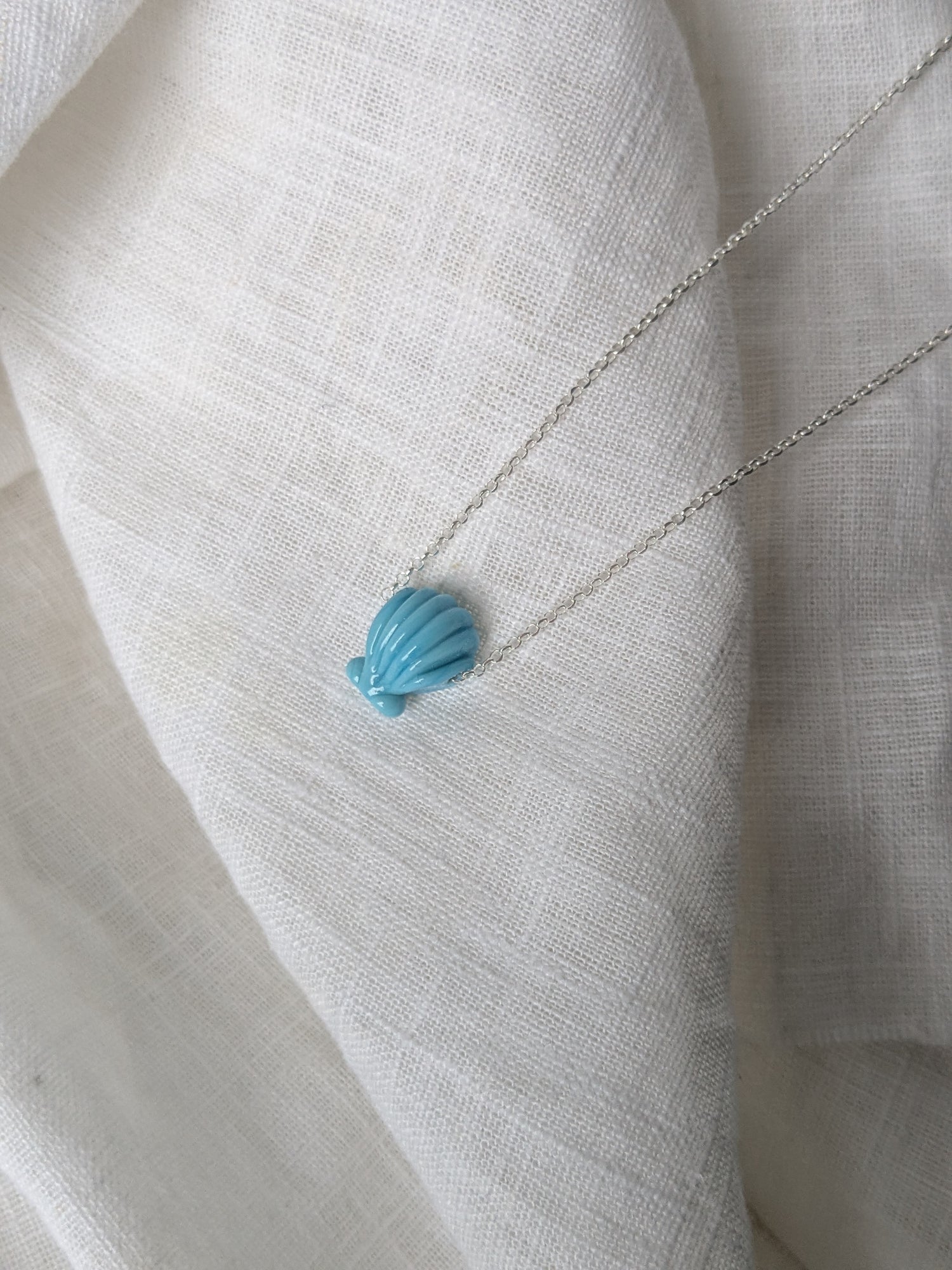 Details - Hand made Italian Murano glass shell available on sterling silver or gold vermeil diamond cut curb chain.
