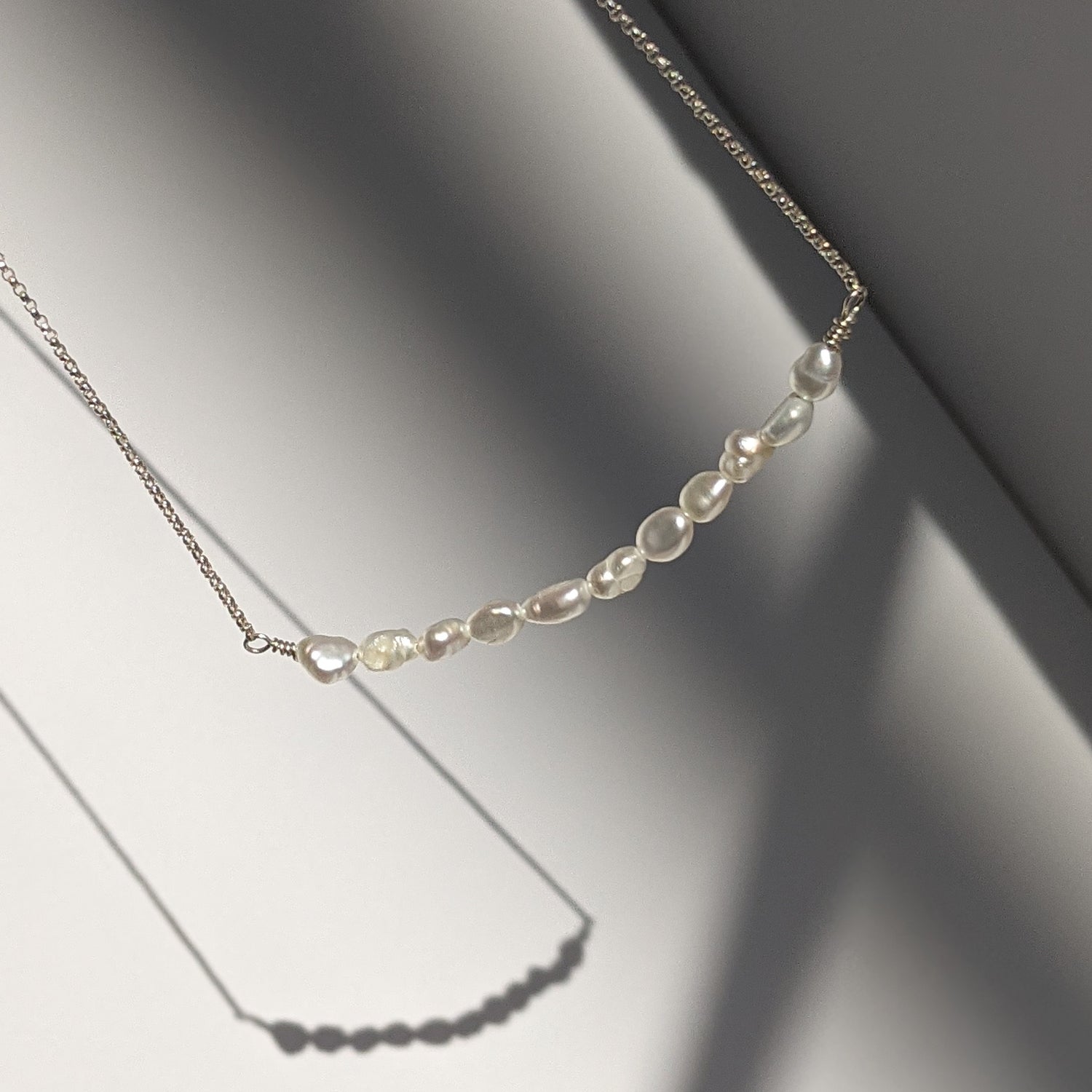 Delicate freshwater seed pearls on a sterling silver belcher chain, this simple yet elegant necklace is a beautiful way to add a finishing touch to that special outfit.