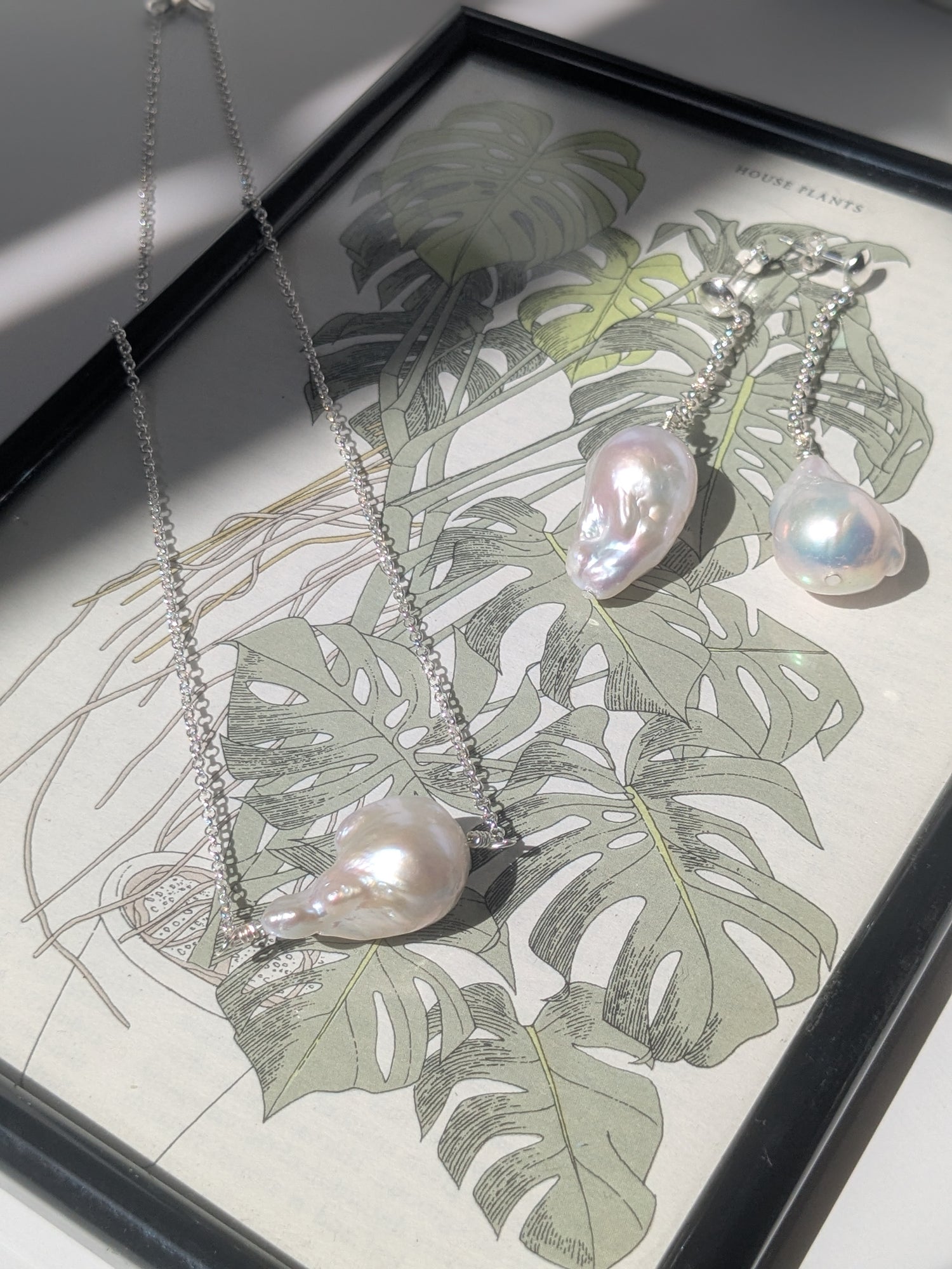 Our Eilidh necklaces are made to order using one of a kind fireball (also known as baroque) freshwater pearls. These pearls are each unique and stunning.
