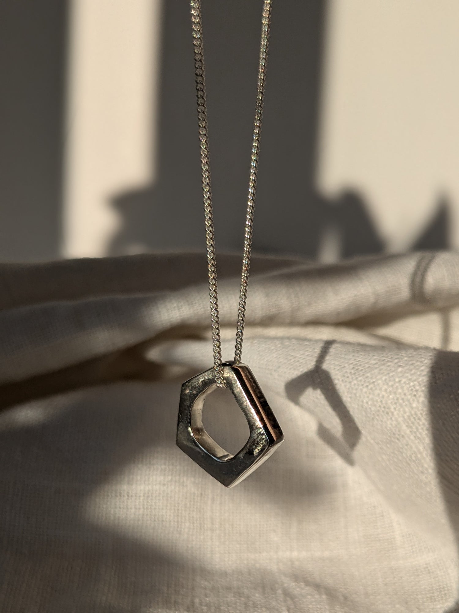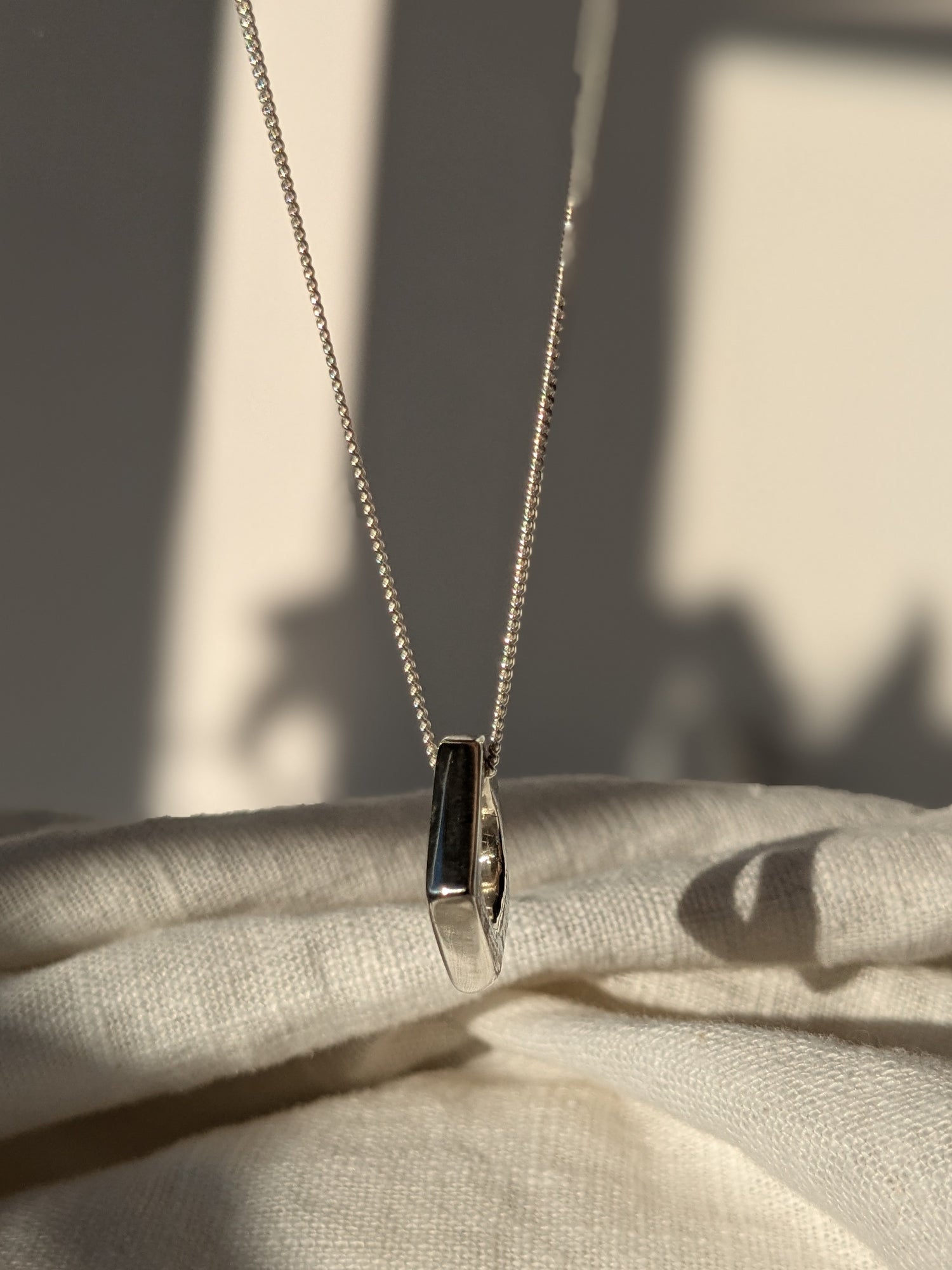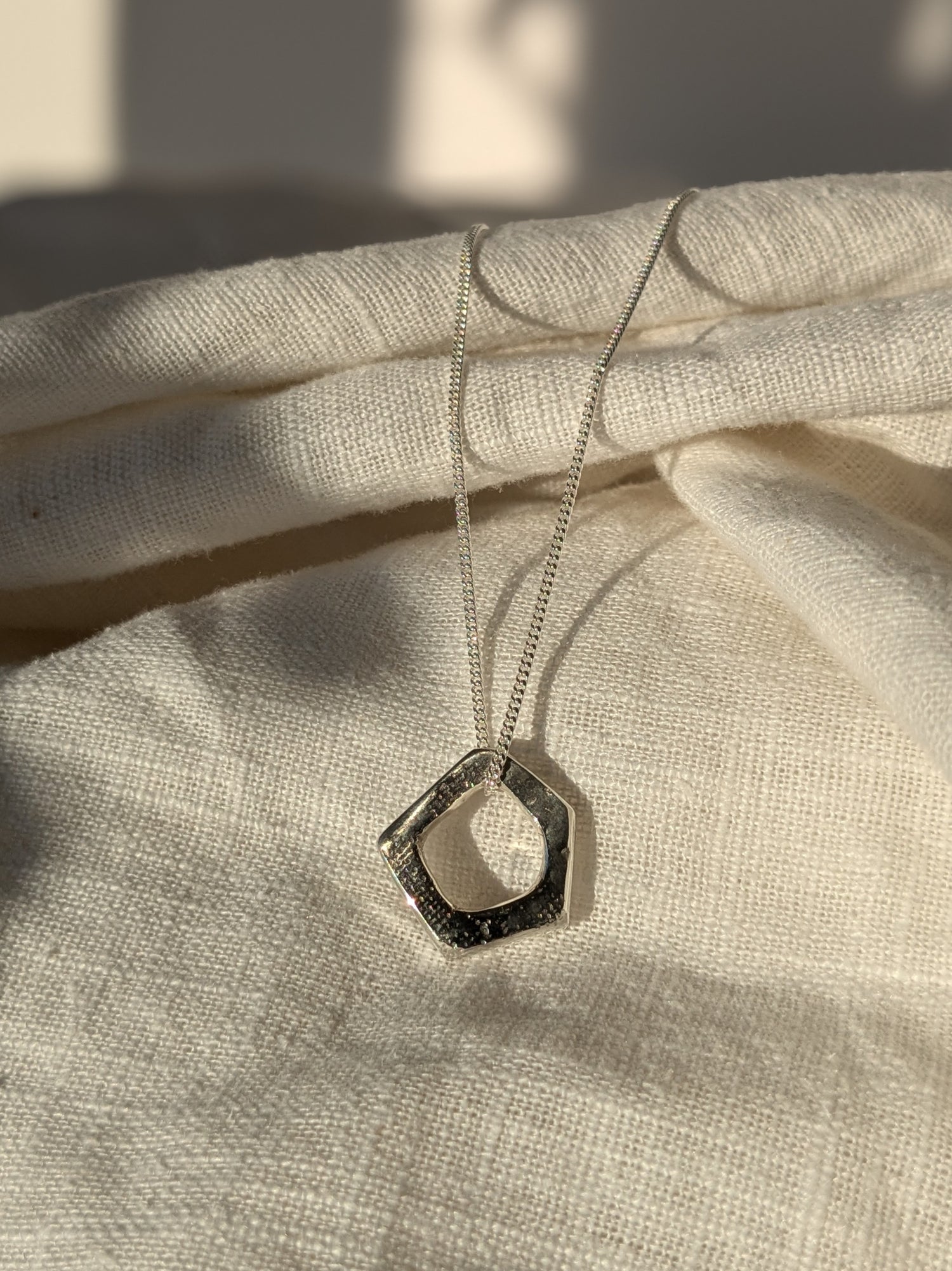 One of our first linen pieces, made from recycled silver this five sided pendant has an arched cut out in its centre. The surface is textured with irish linen one one side and the other has been polished to a high shine smooth mirror finish.