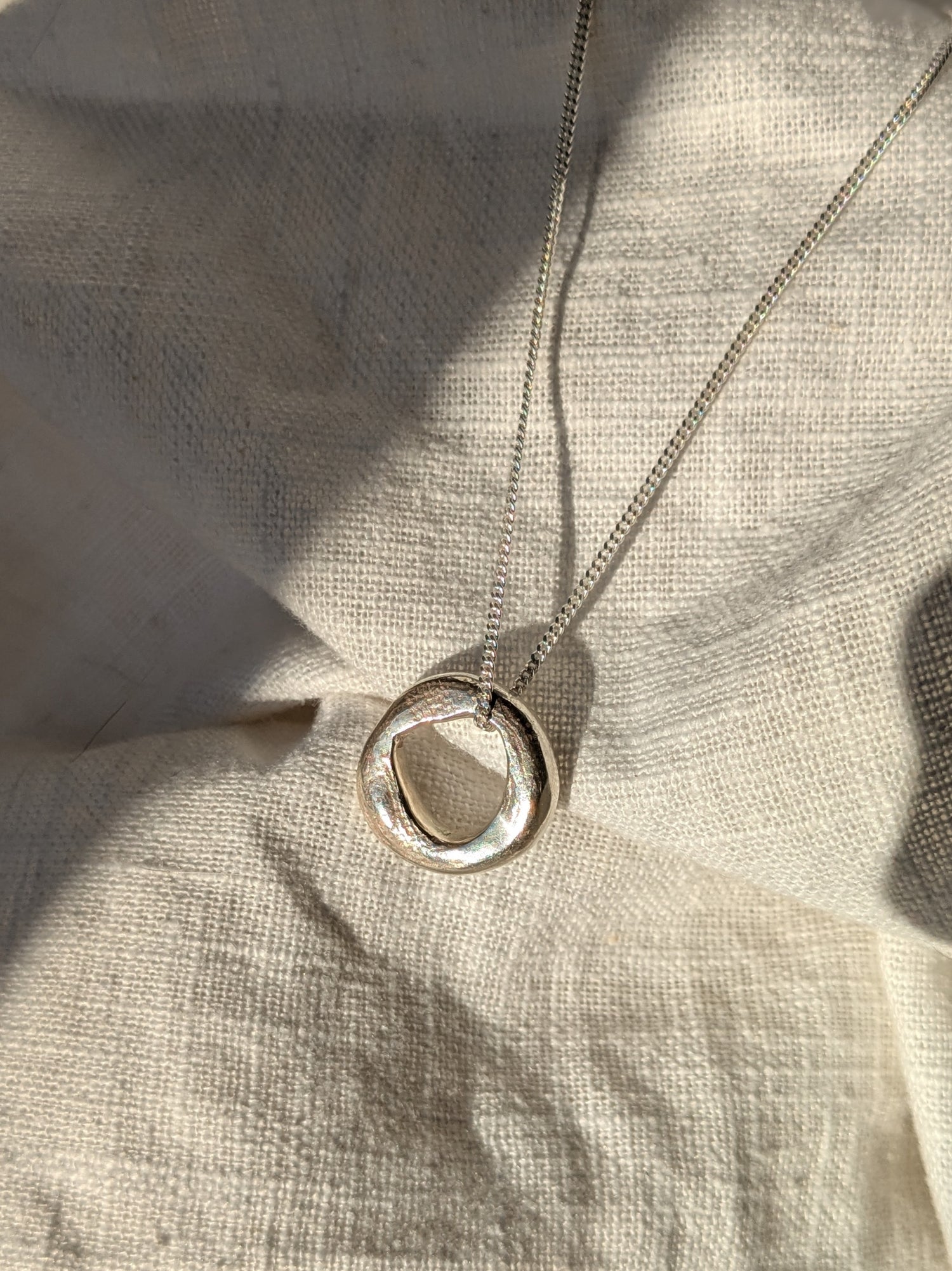 One of our first linen pieces, made from recycled silver this organic circular pendant has an arched cut out in its centre. The surface is textured with irish linen in some parts and in others it is a high shine smooth mirror finish.