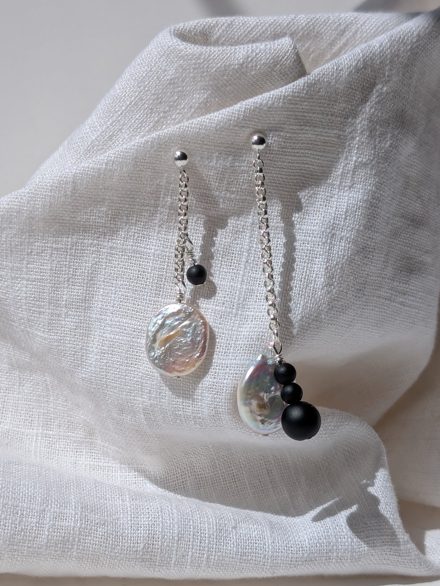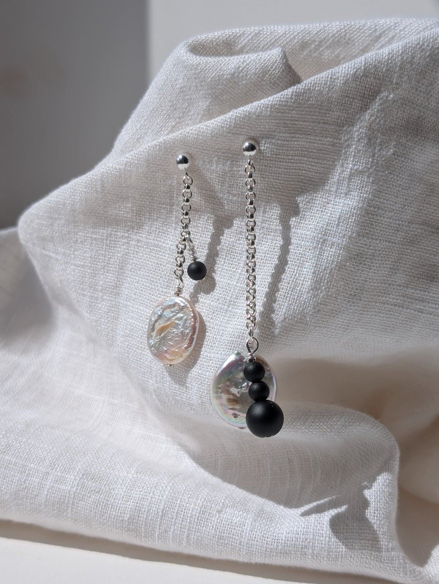 Earrings - Asymetric with one side longer than the other these can be worn together or singly. We just love the shine of pearl agains the matt black agate