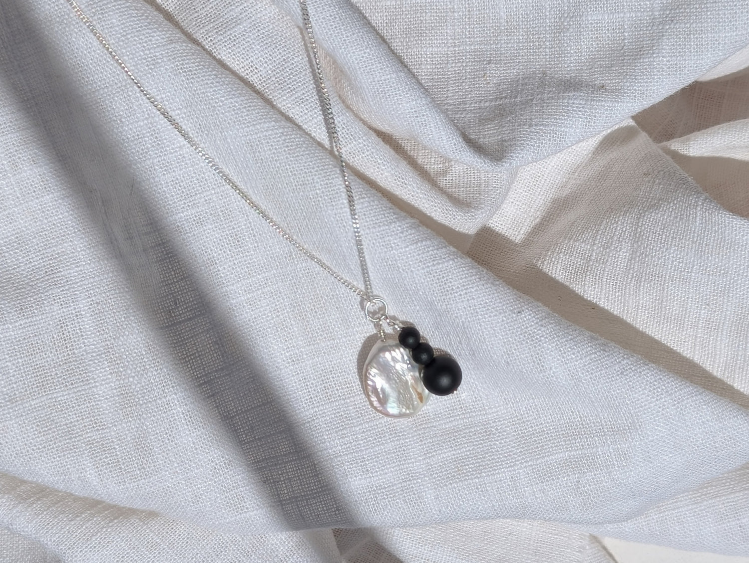 Matt Black agate beads compliment beautiful ivory flat pearls. A modern take on pearls, our flat pearls have a gorgeous irridescant shine to them. Each and every pearl is unique and different in shape and colour.