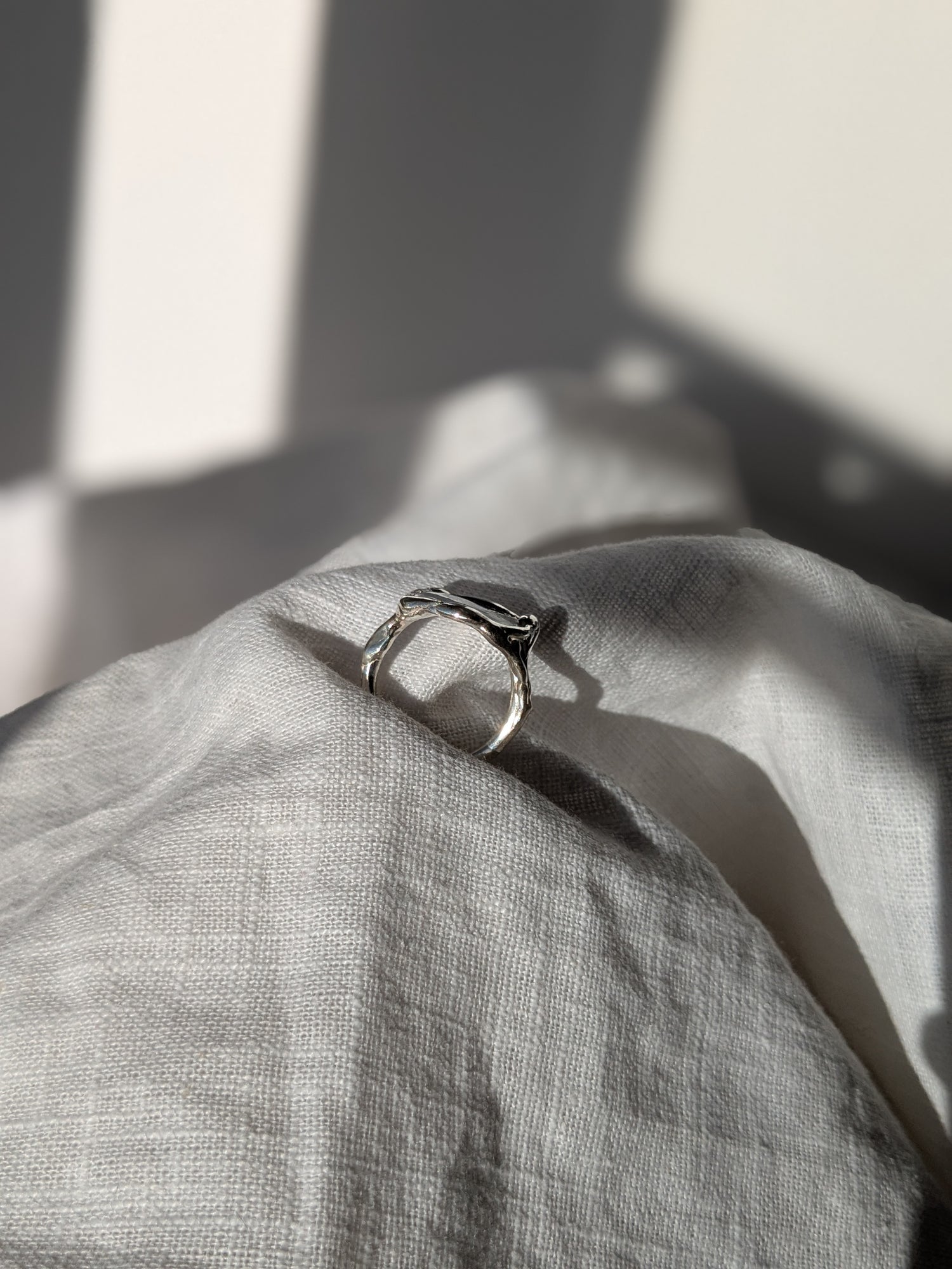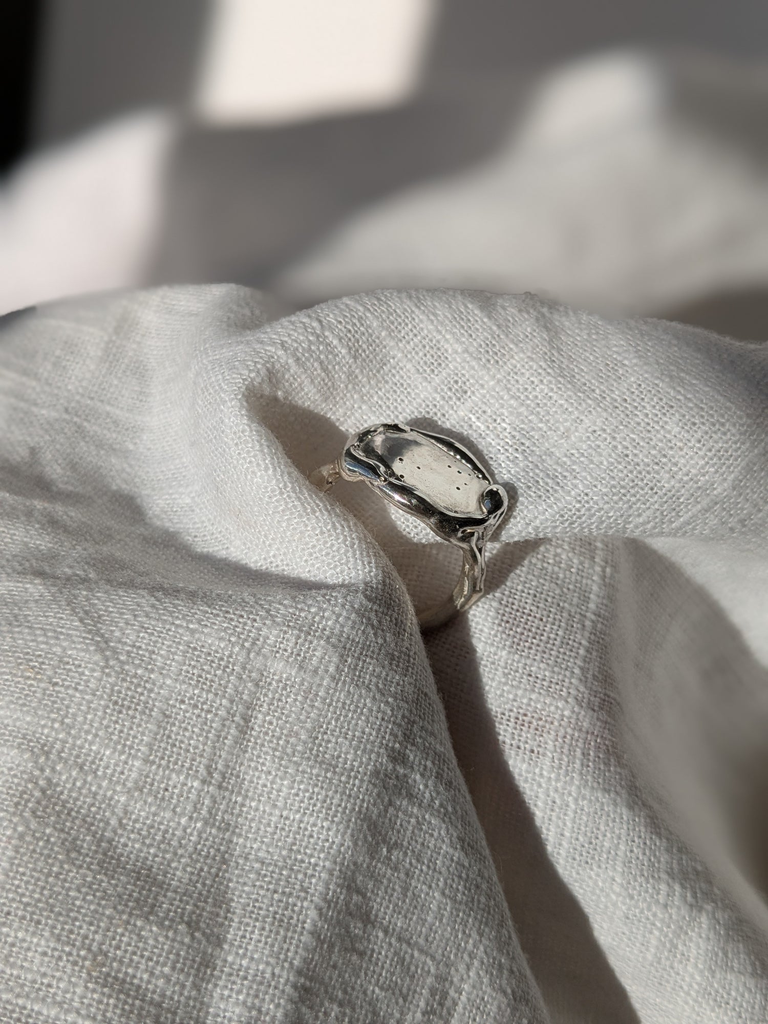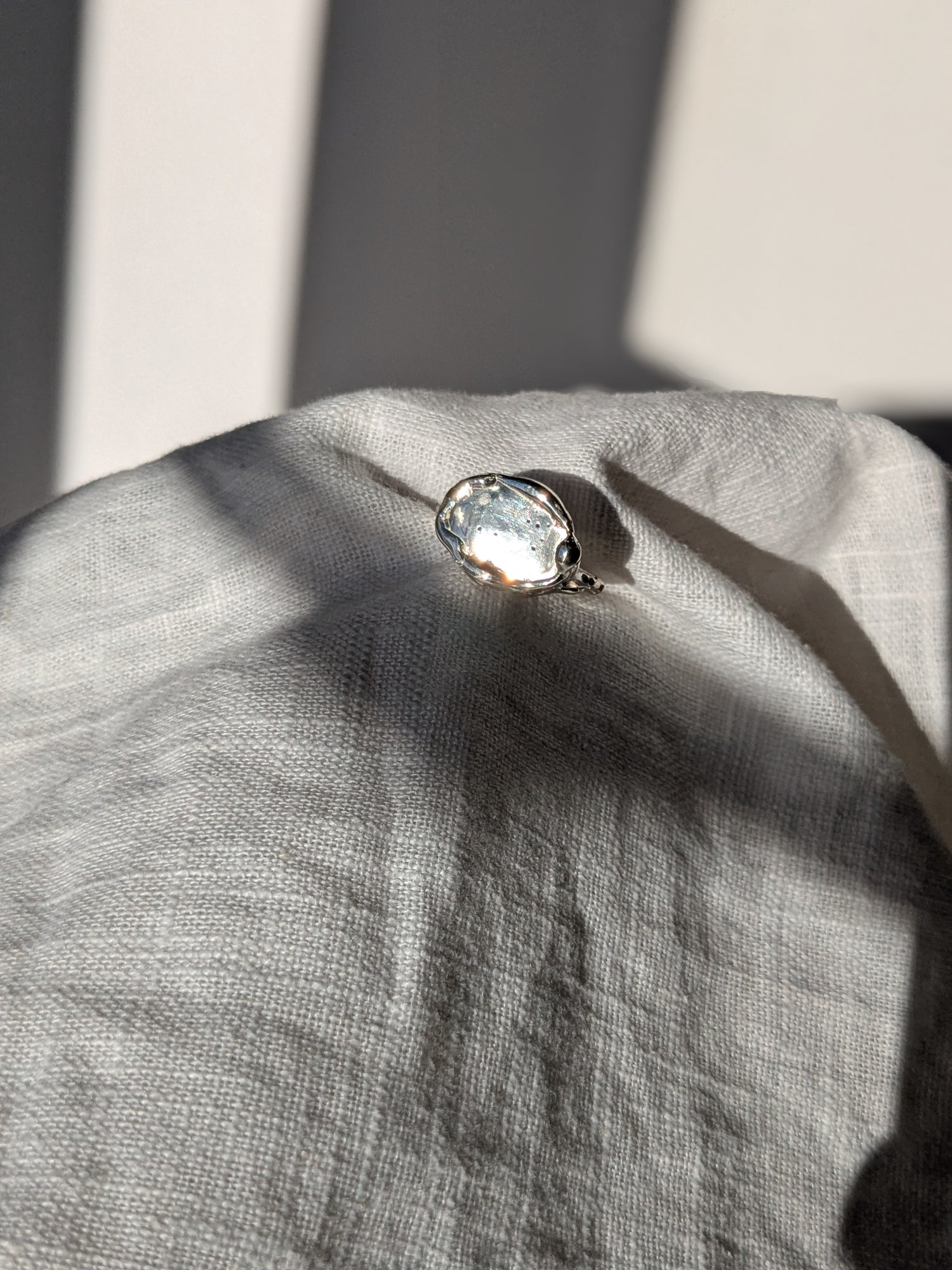 One of a kind hand made molten ring. This oval organic shape ring has a shiny surface with small molten drips around the edge and some delicate bubbles.