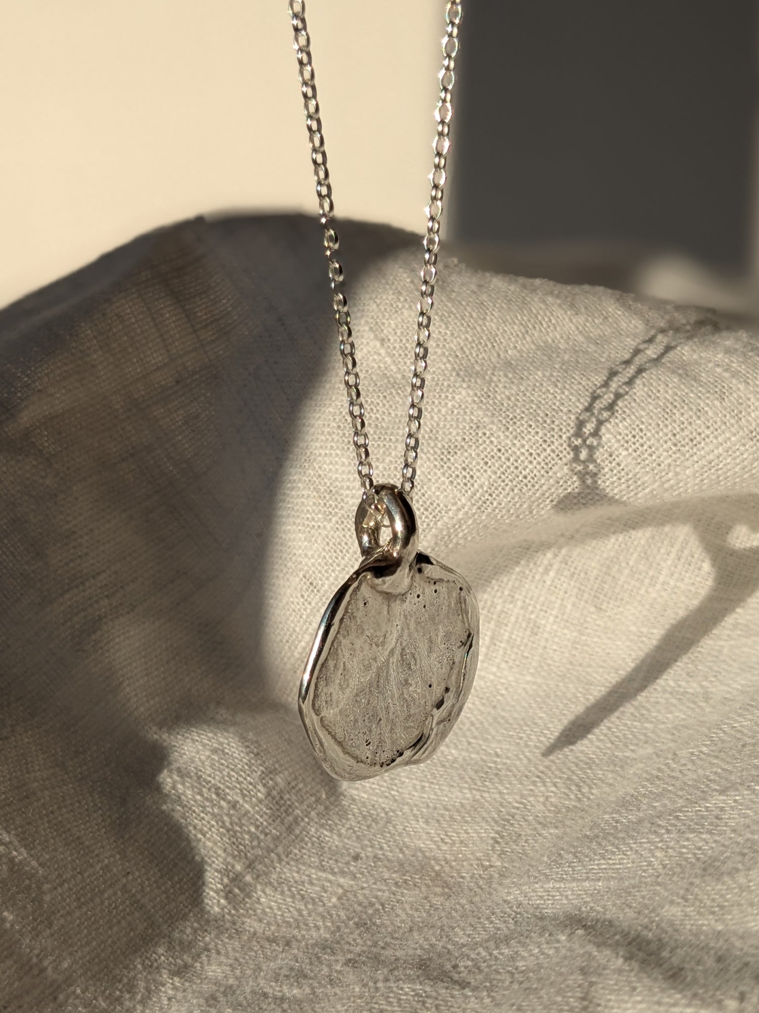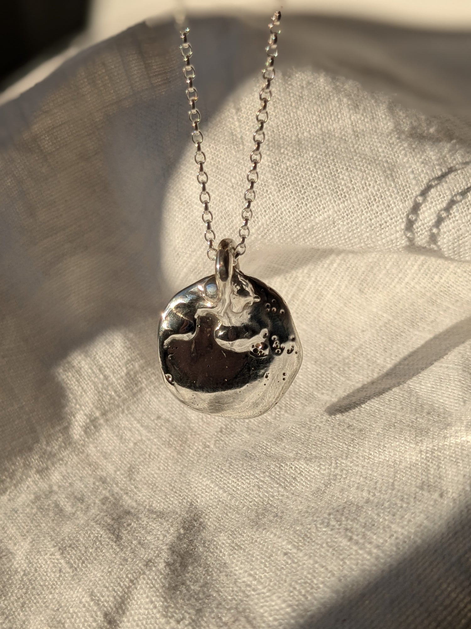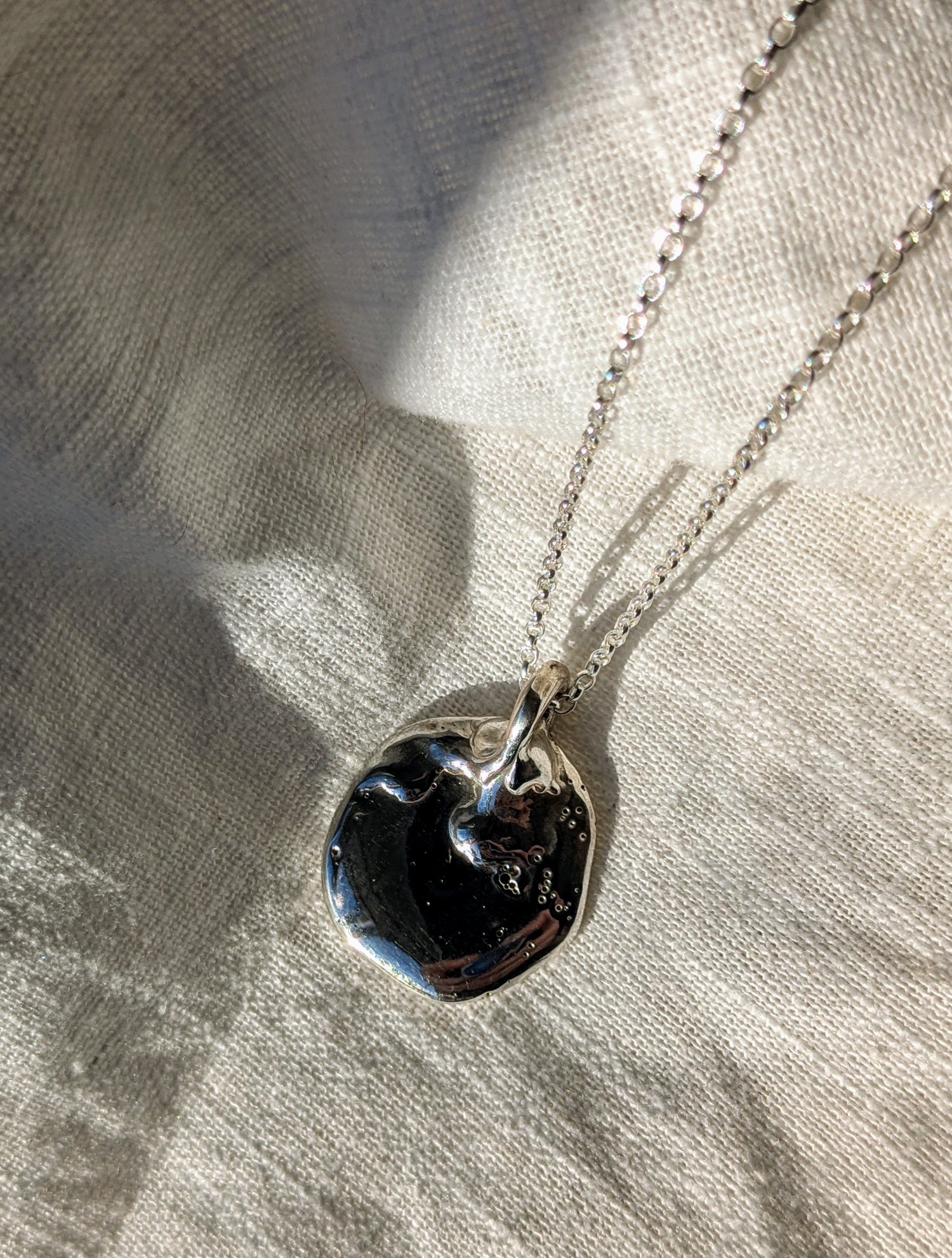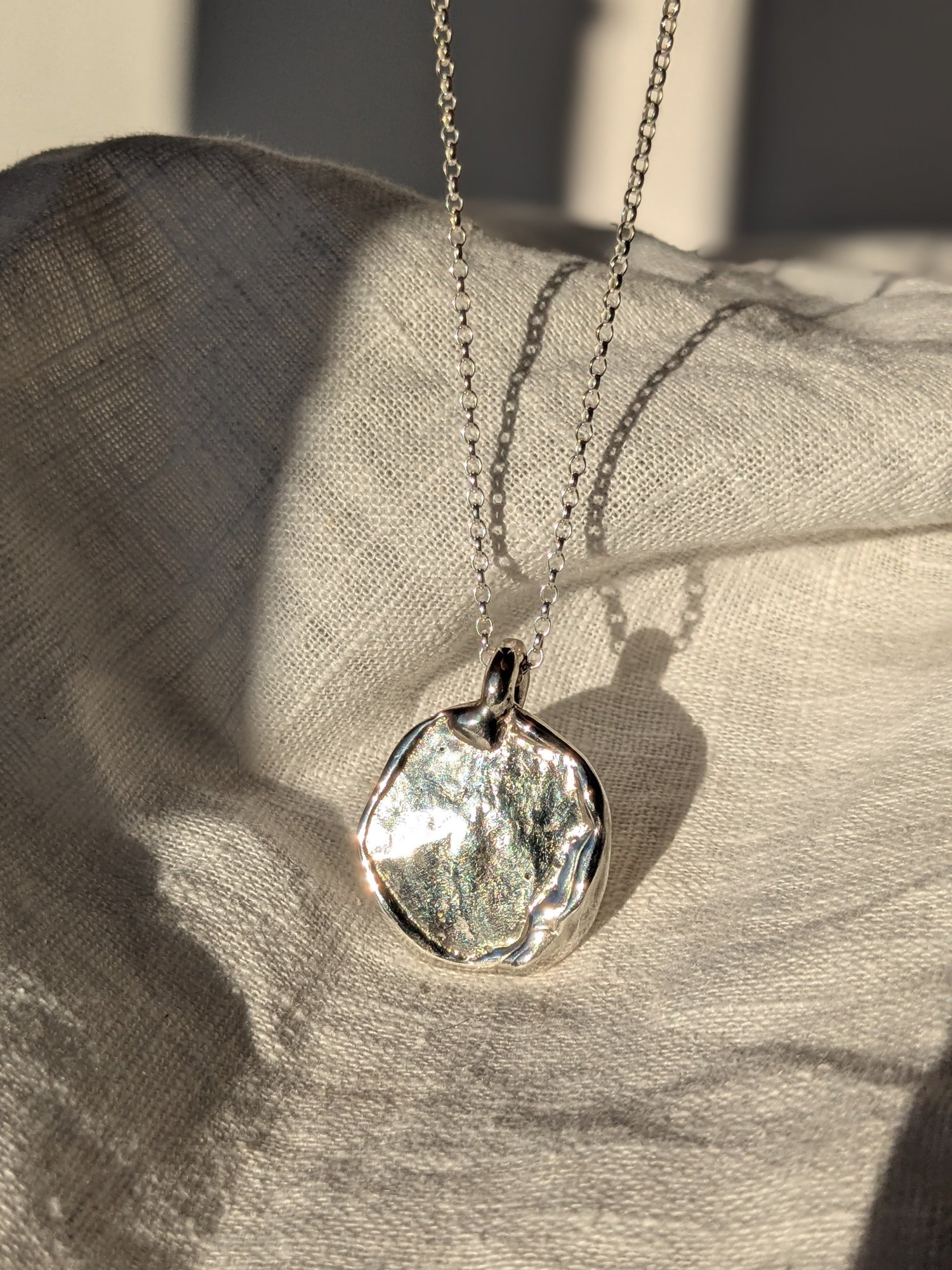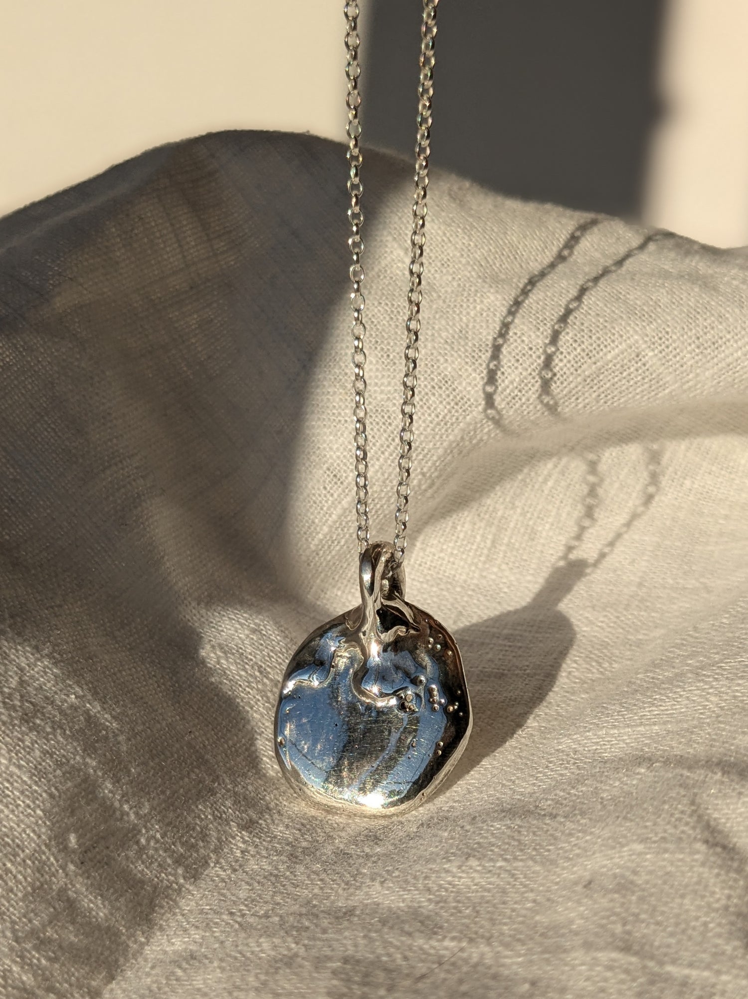 Carved in molten wax and then cast in recycled silver this is a beautiful tactile pendant in an organic soft coin shape.