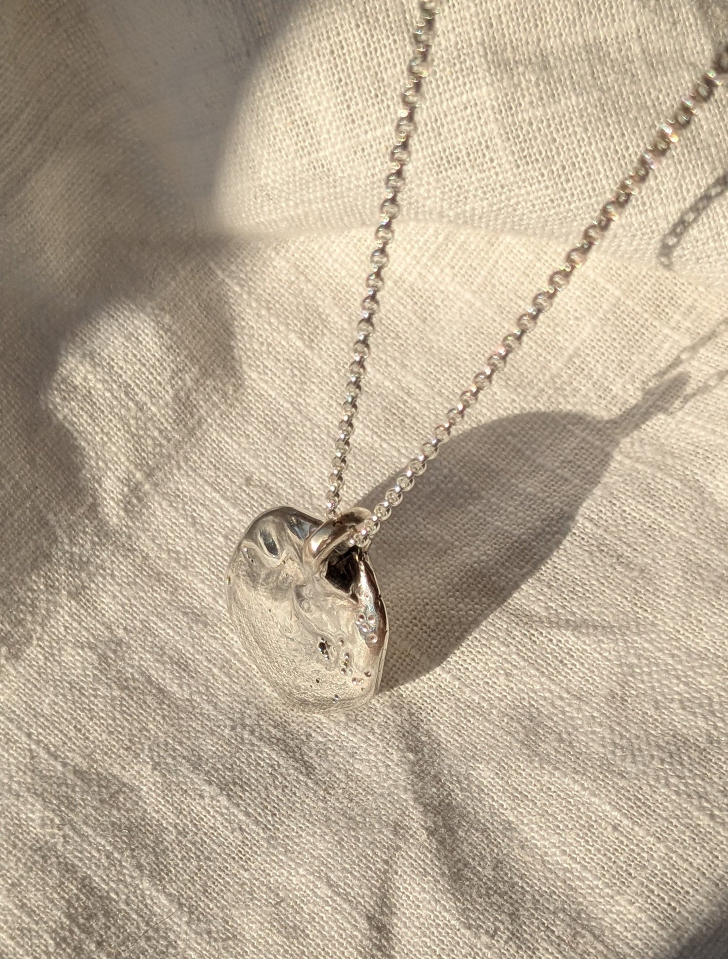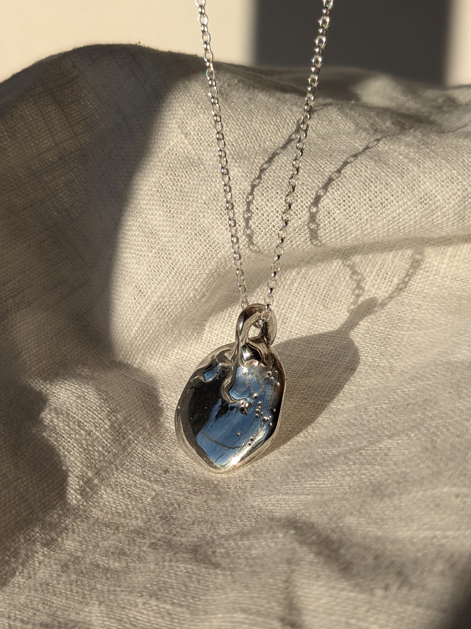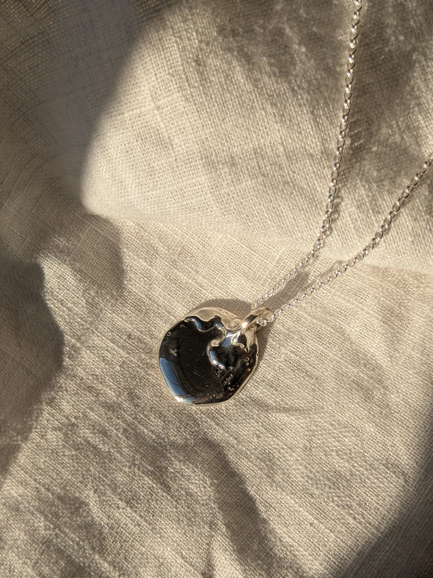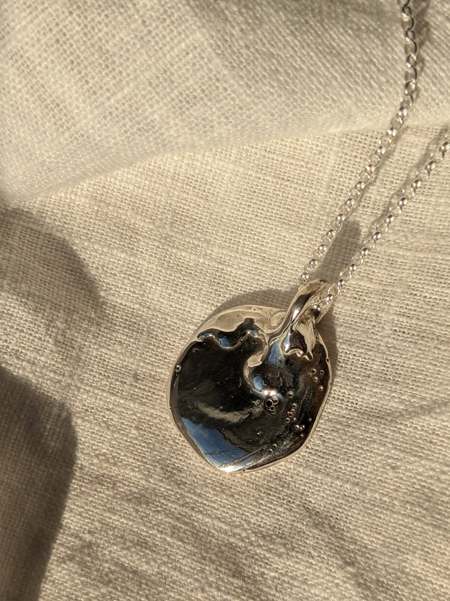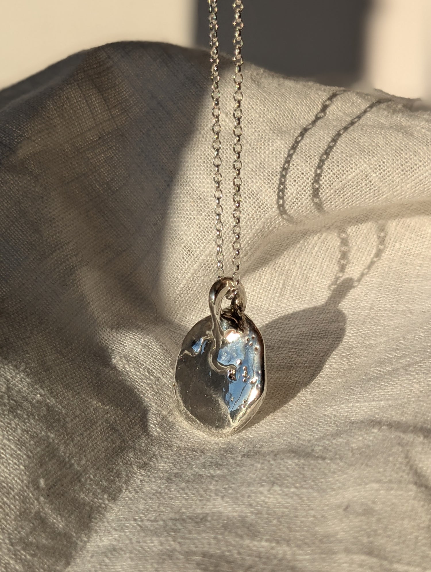 Carved in molten wax and then cast in recycled silver this is a beautiful tactile pendant in an organic soft coin shape.