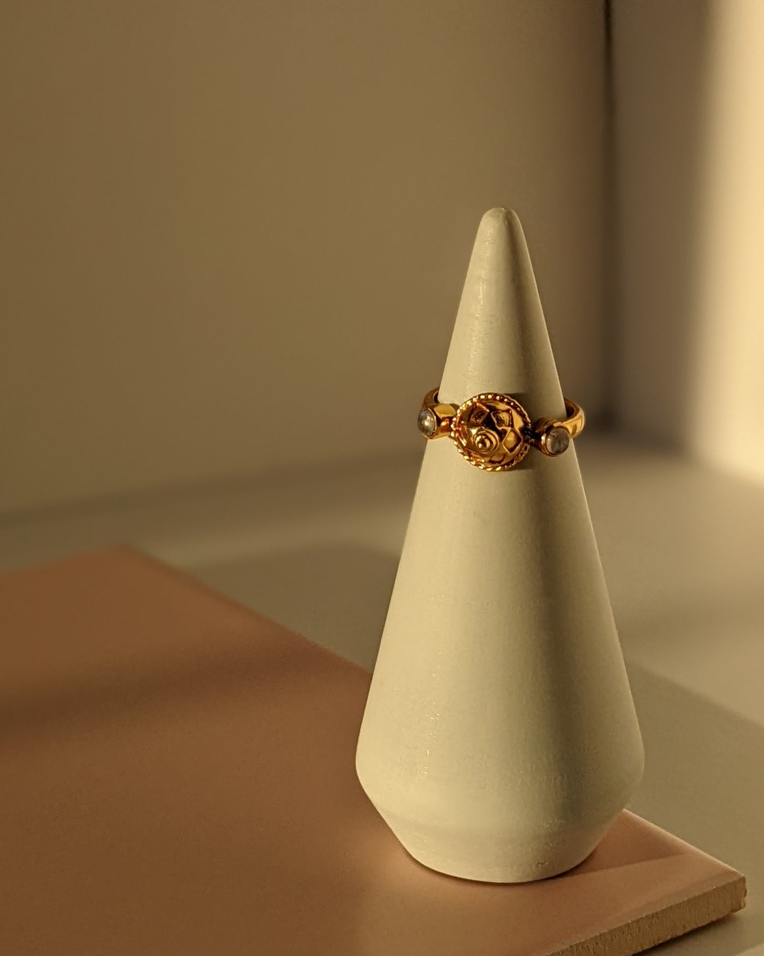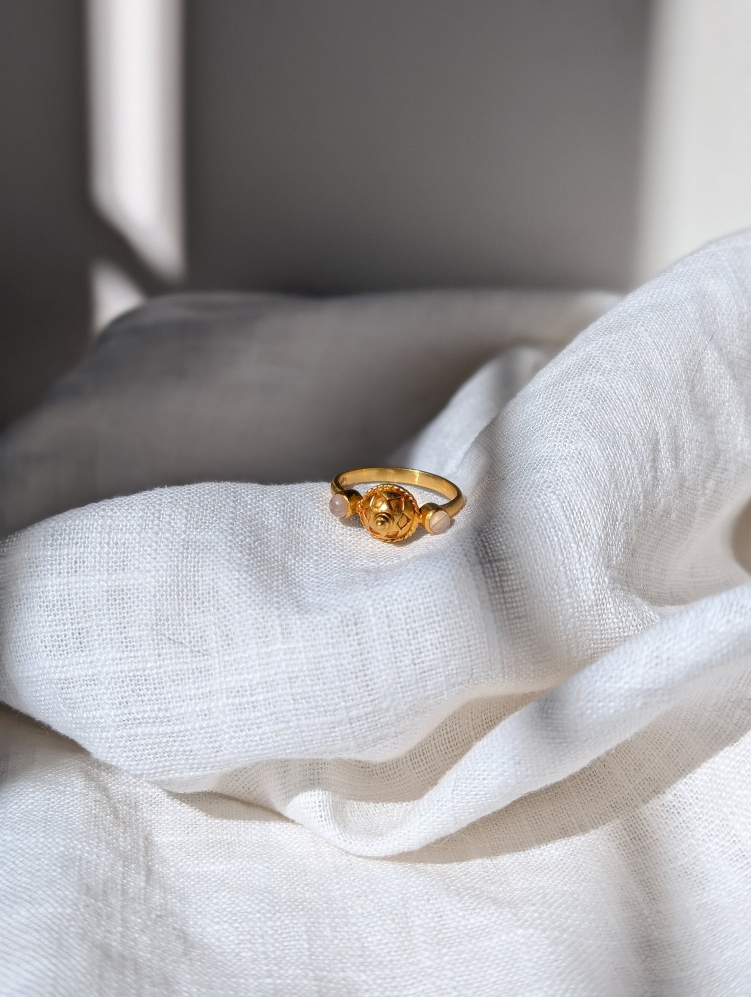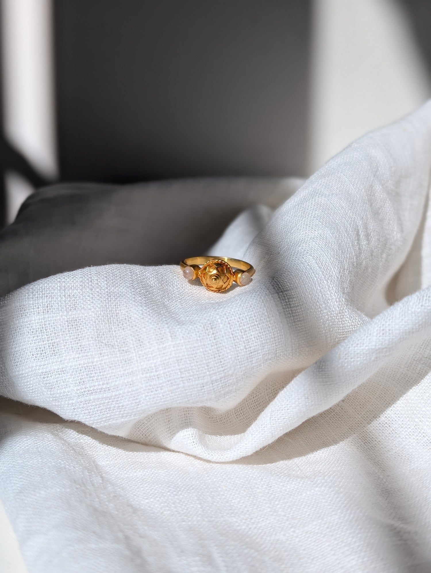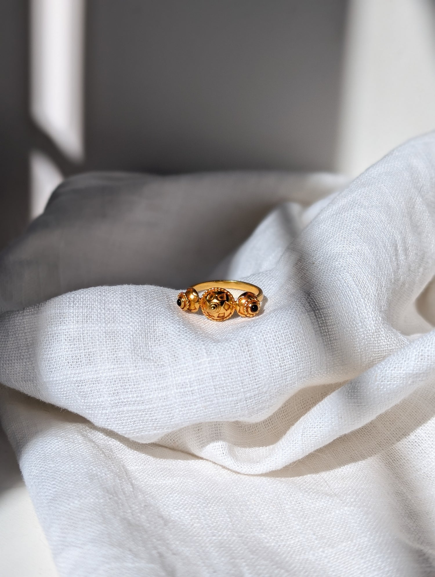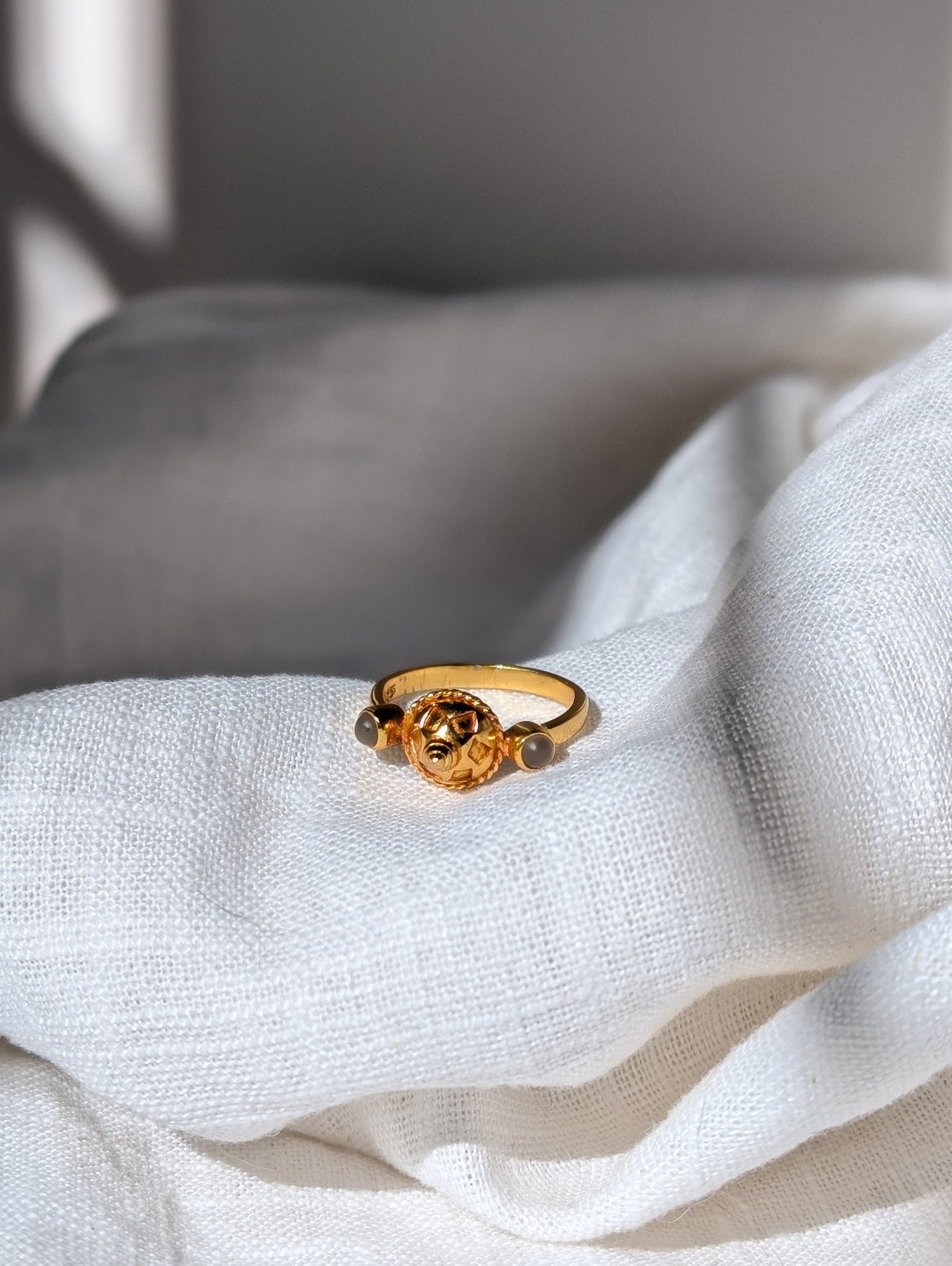 This delicate ring has a beautiful carved central point with two small round semi precious stoneson either side. Sterling silver plated with rich 24 carat yellow gold