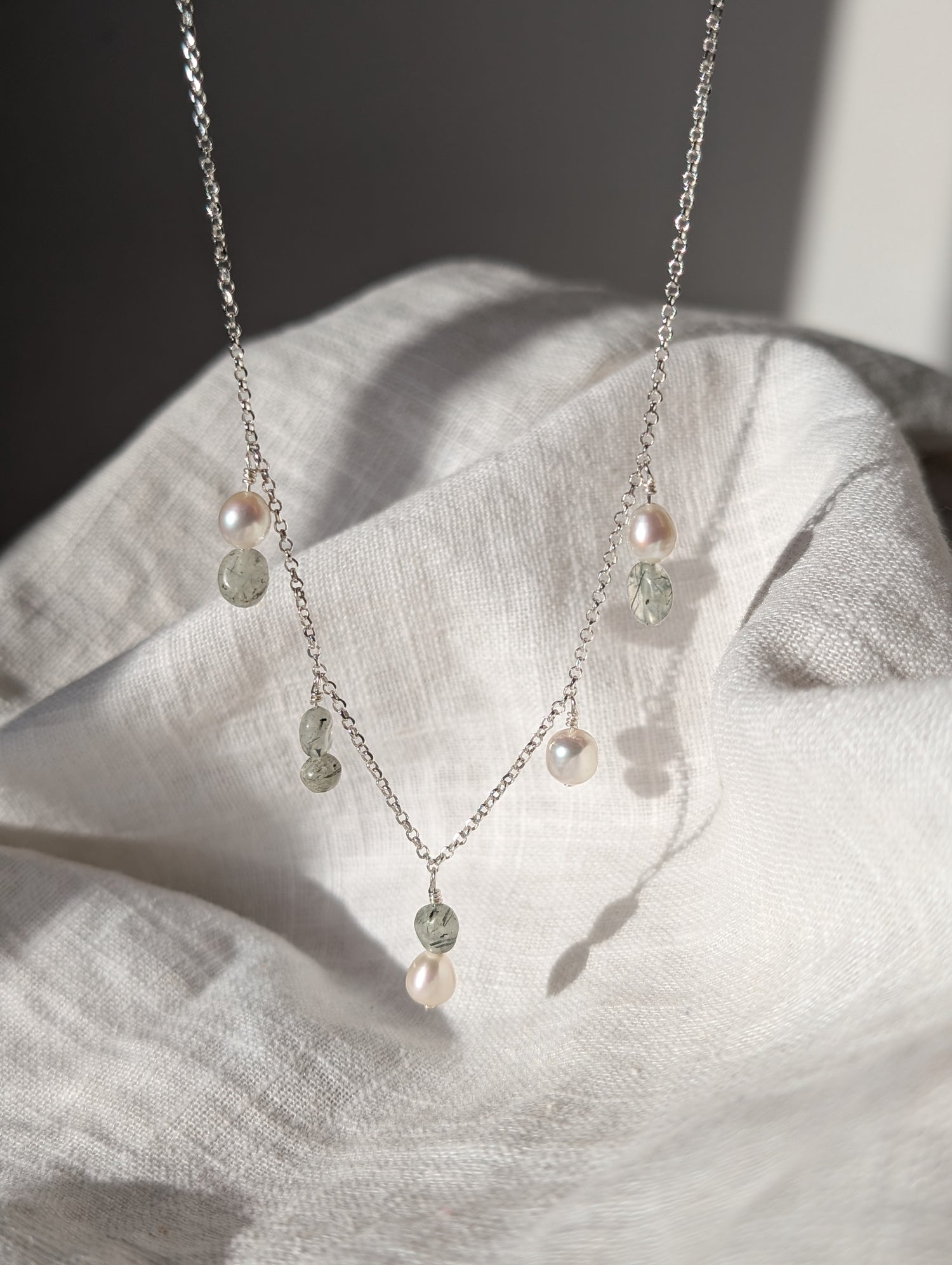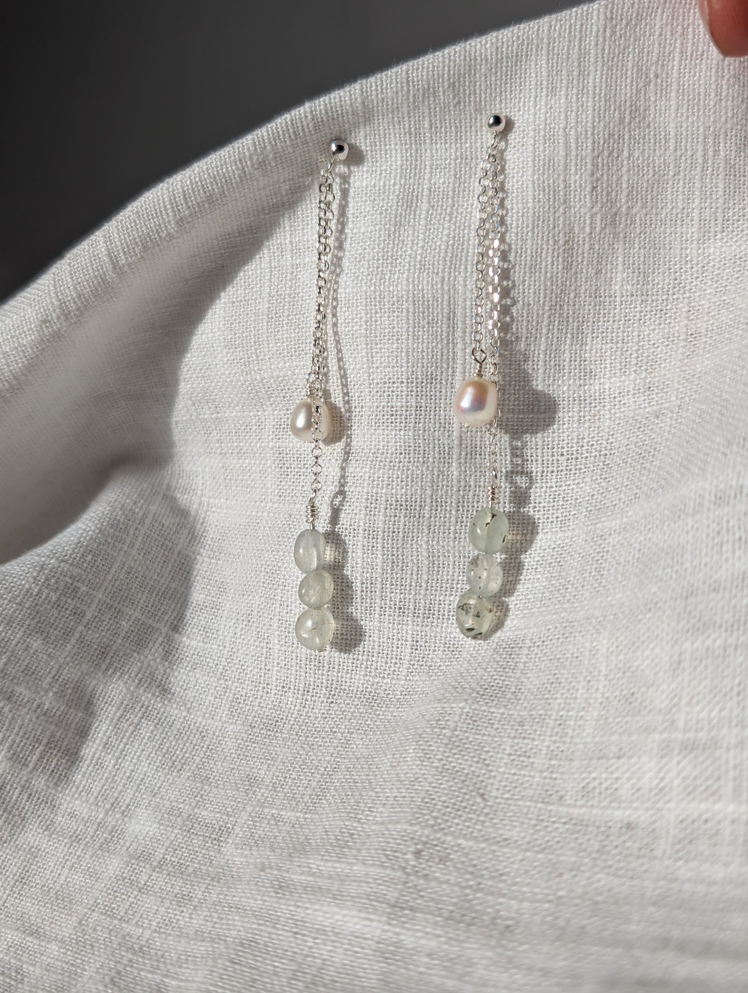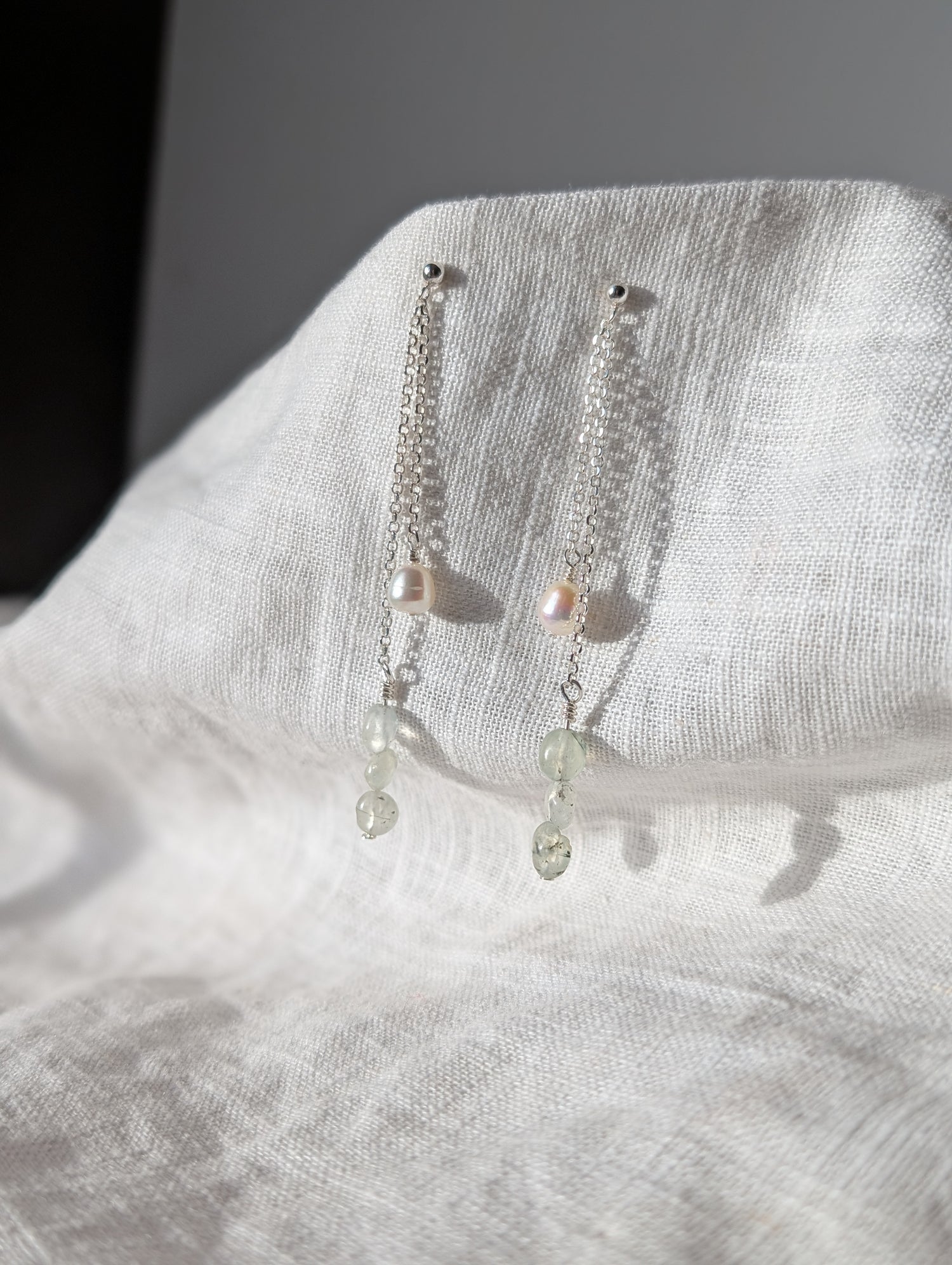 Our popular pearl & chain drop earrings are updated delicate moss agate and ivory reclaimed pearls.