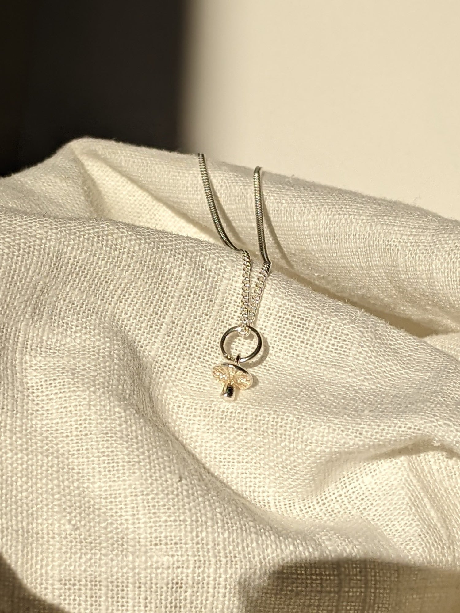This super cute mushroom charm is sterling silver or gold vermeil and comes on a matching 18 inch diamond cut curb chain.