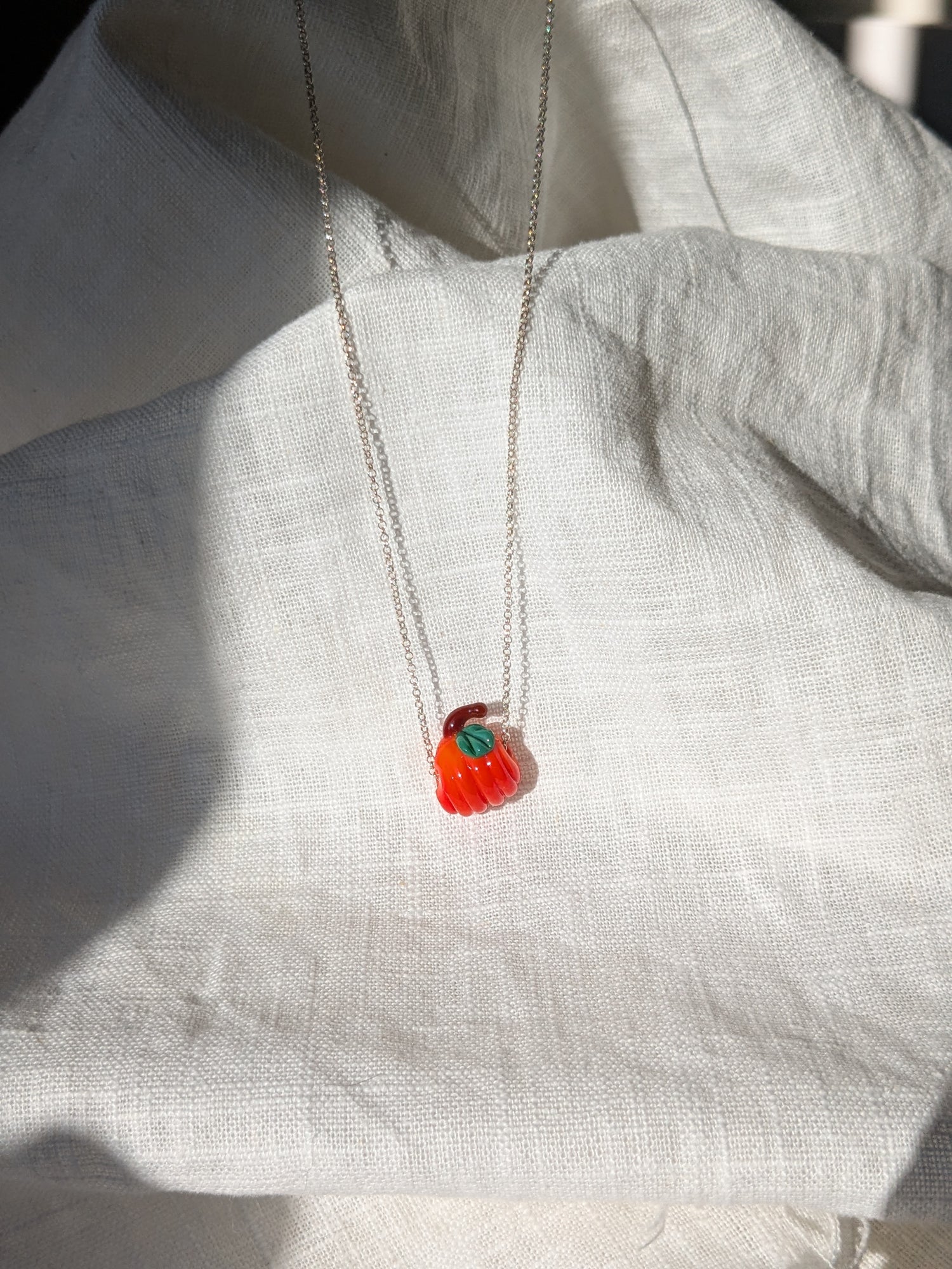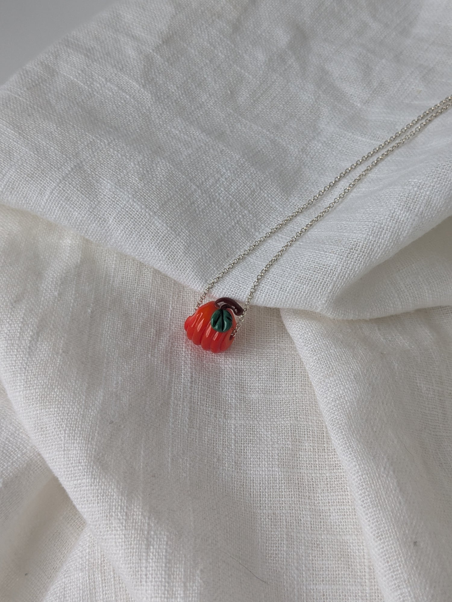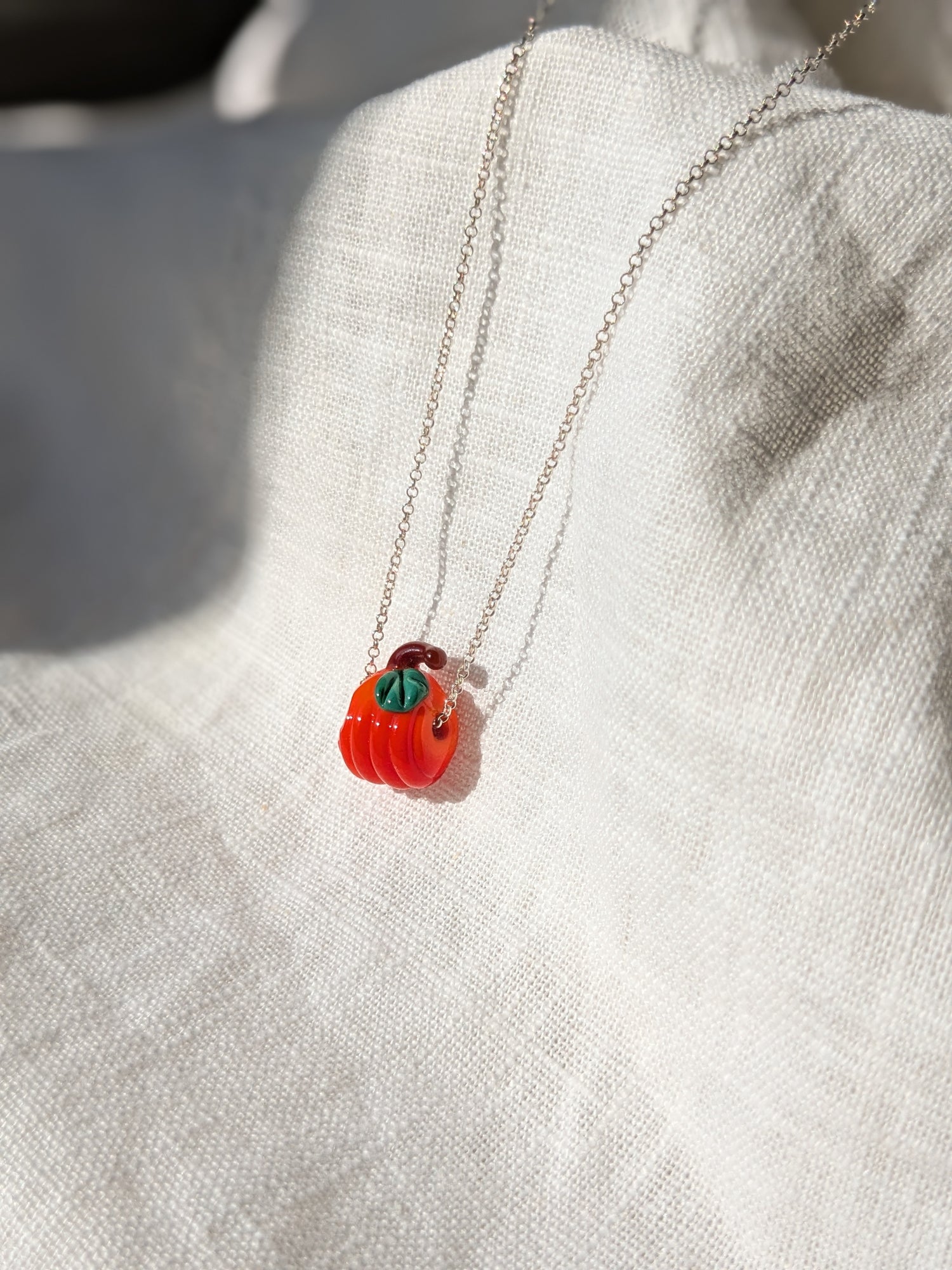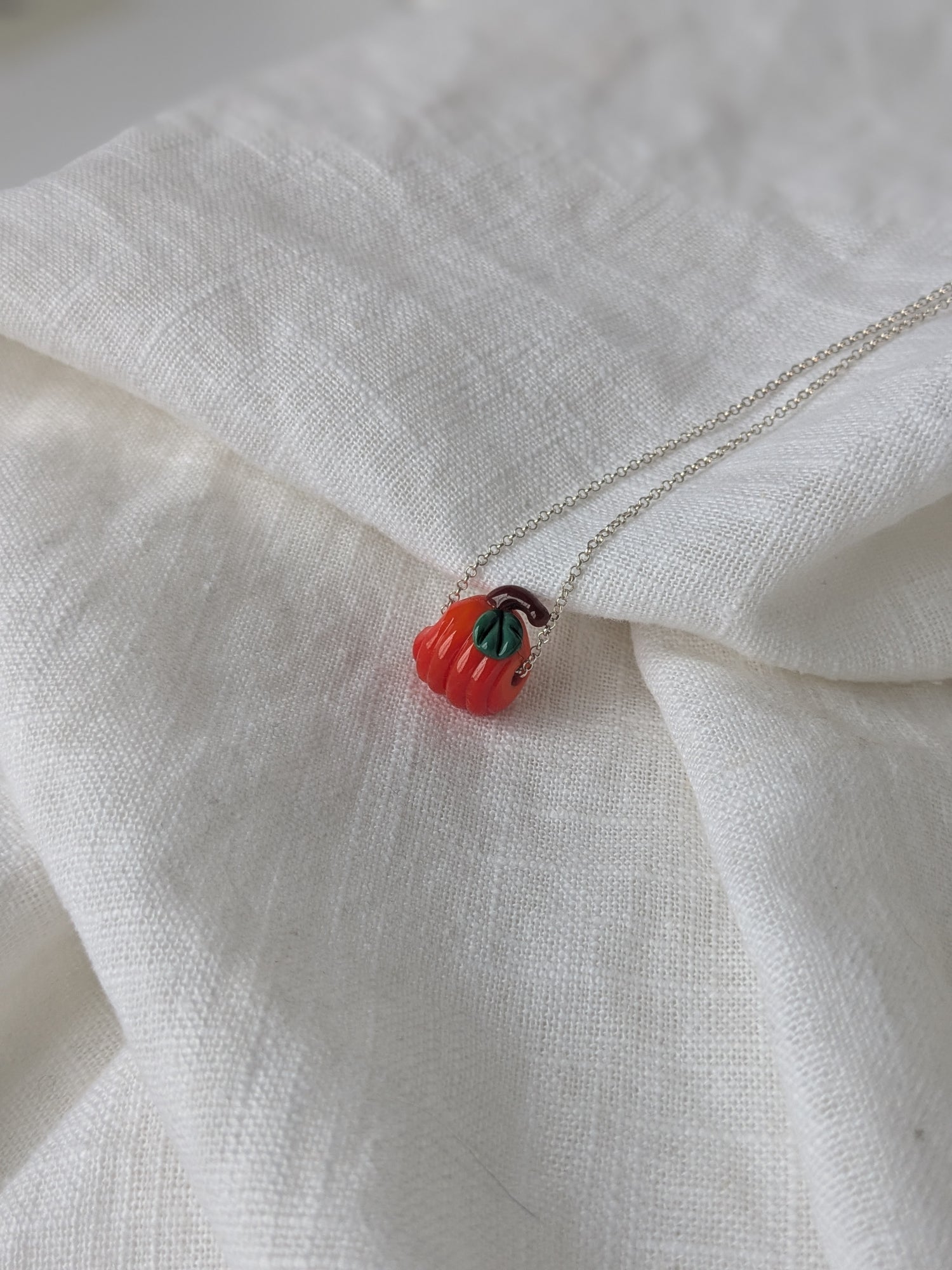 Our little pumpkin necklace is made from murano glass on a 16inch sterling silver belcher chain.