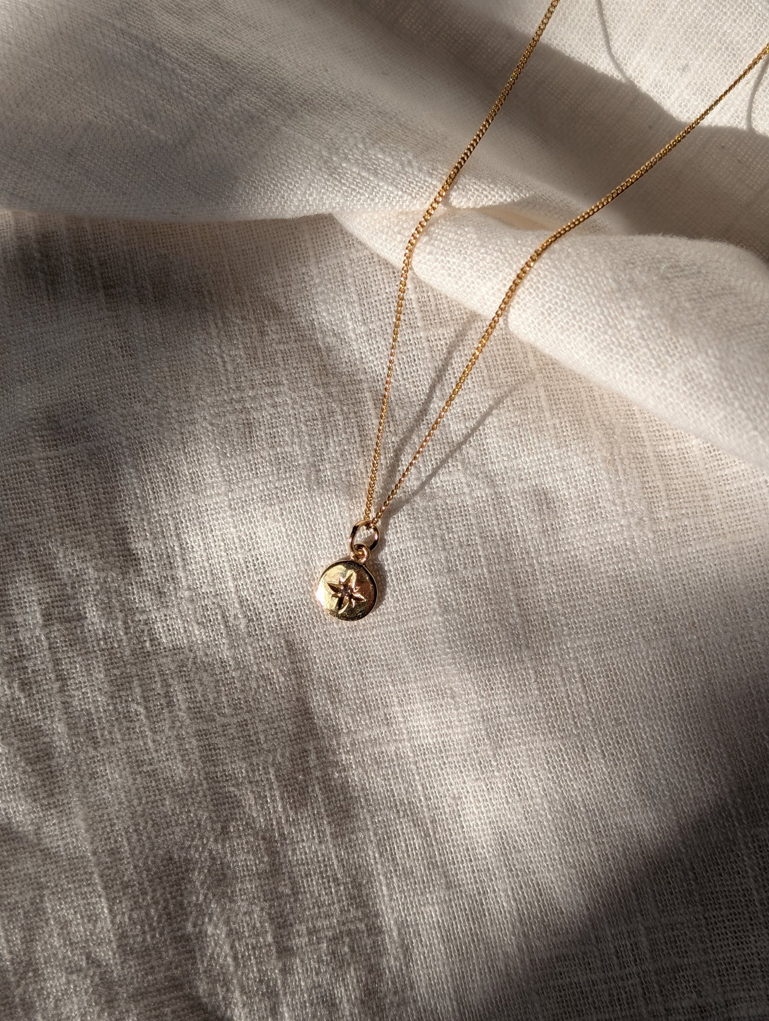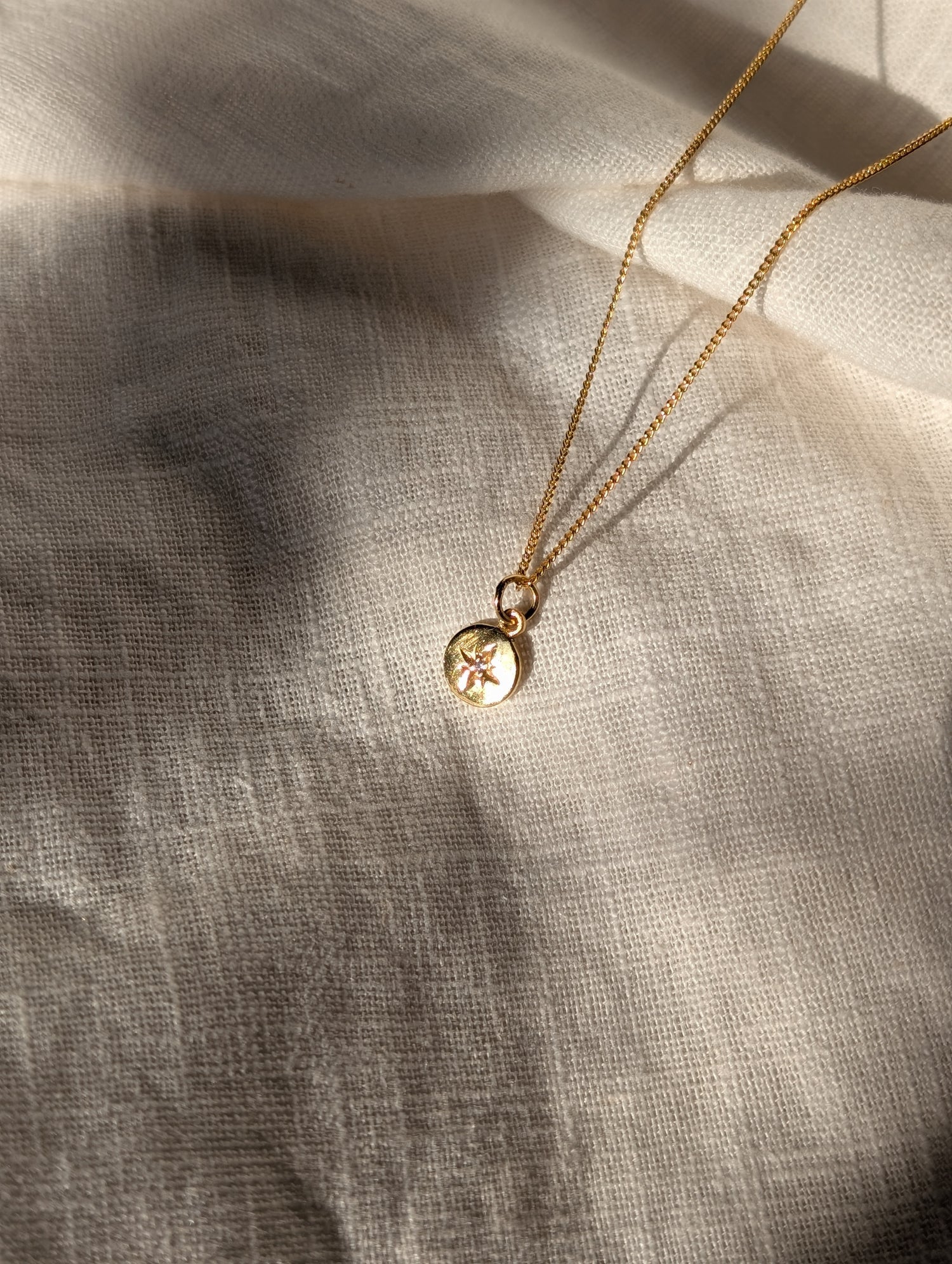 Classic star pendant in gold vermeil & cubic zirconia. Our round pendant with a carved star and a crystal detail is a beautiful addition to any outfit. On a 16 inch gold vermeil chain.