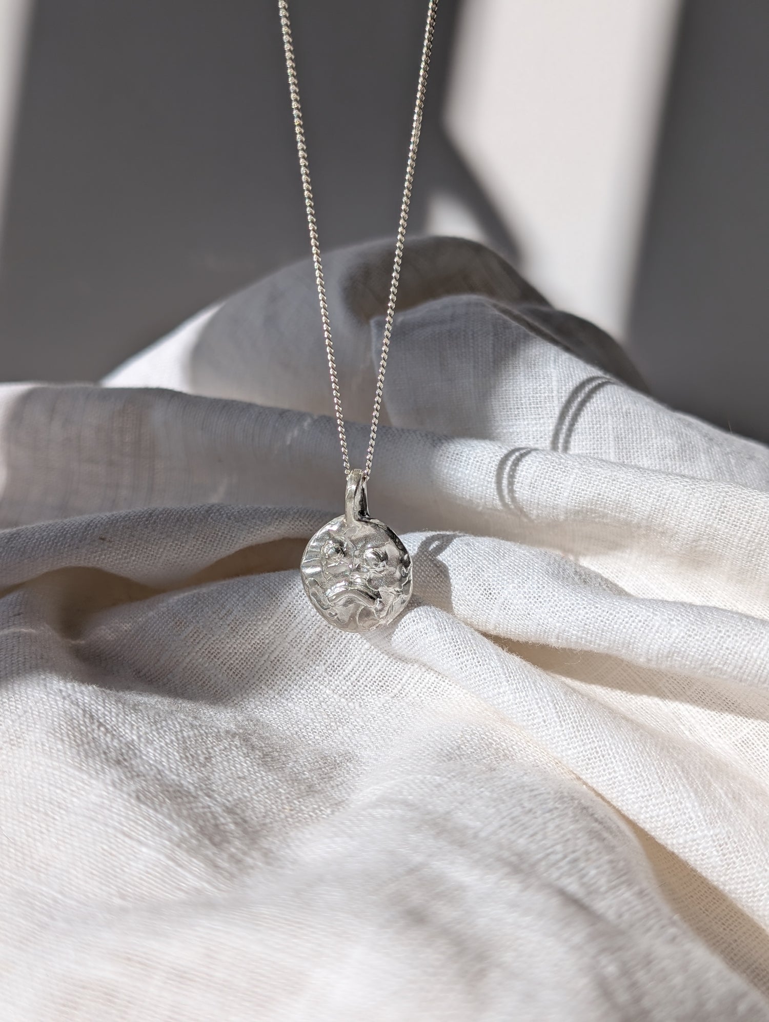 Our happy Sásta silver pendant is the perfect companion whatever you feel that day. A chunky tactile smiley pendant made from recycled silver this wee guy will warn folk what mood you are in. One side has a cute smile and the other side has a grumpy or sad frown!