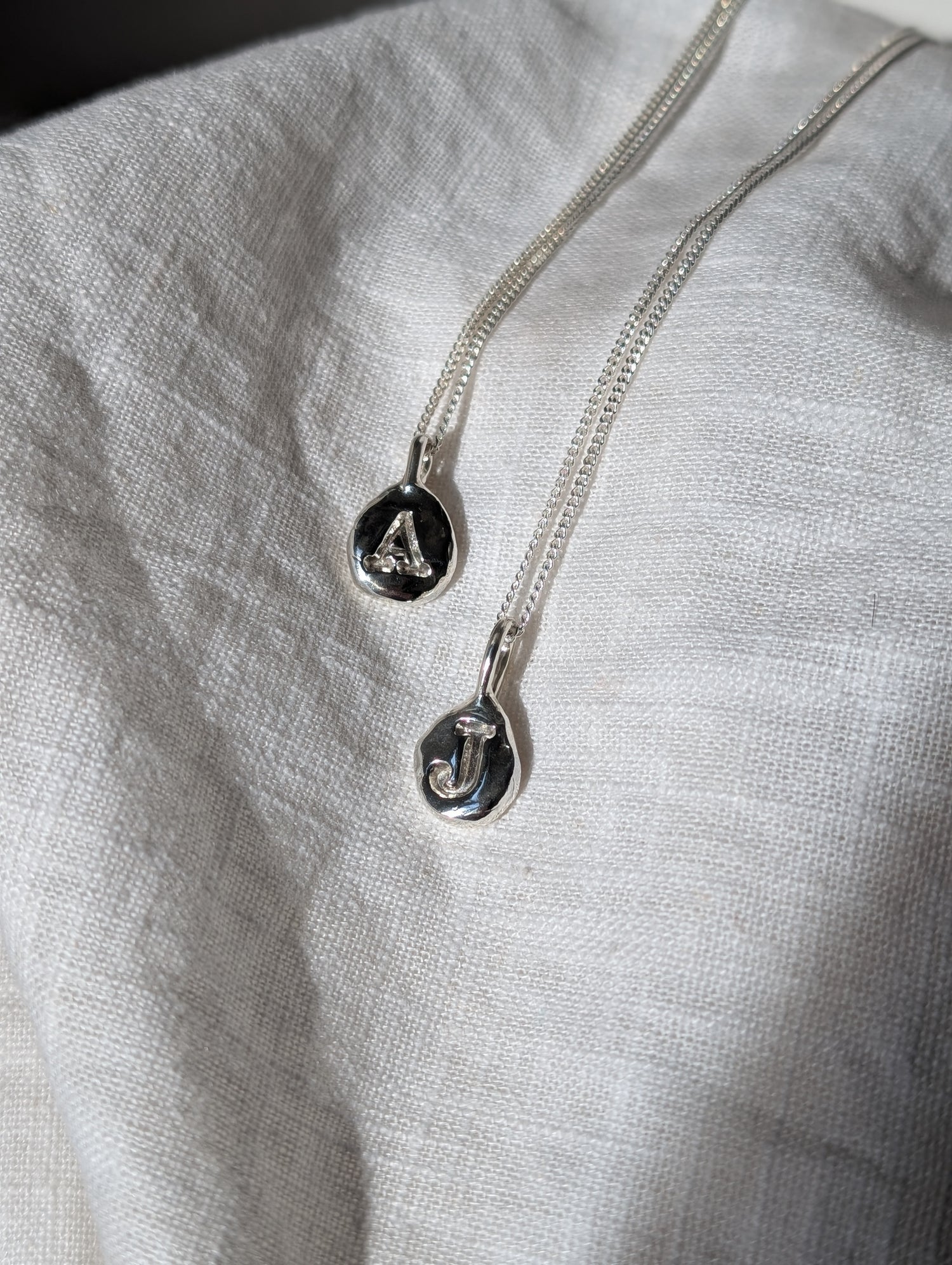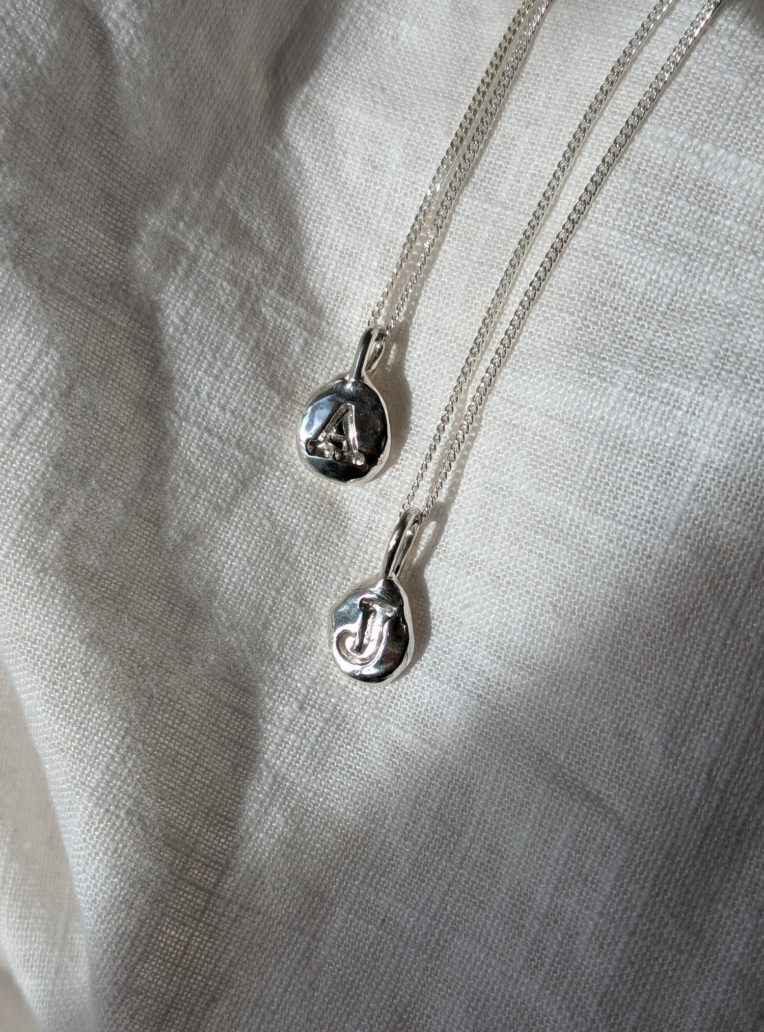 Each nugget has the signature Becca Calmont one of a kind raw texture. You letter is stamped in the wax and then sent off to Scotland to be cast in silver. Each piece is made to order to will take at least 4 weeks to make. It may take longer depending on the time of year etc. So please reach out and ask if you need for a certain date.