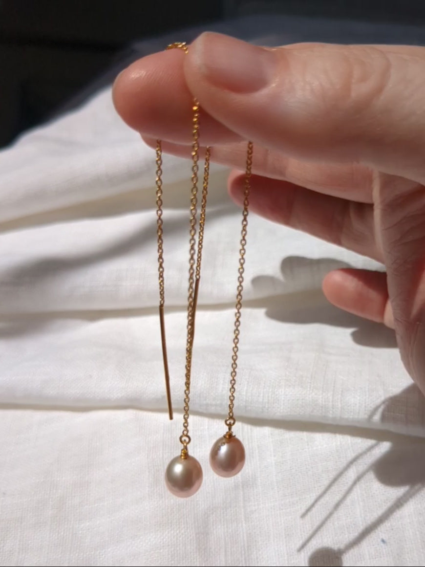 Our Sway pearl ear threaders are the perfect mix of delicate and statement. These gold vermeil posts and chain are finished with a perfect tear drop freshwater pearl. Available with pale pink or ivory pearls these earrings are the perfect pearls for any time of the day!