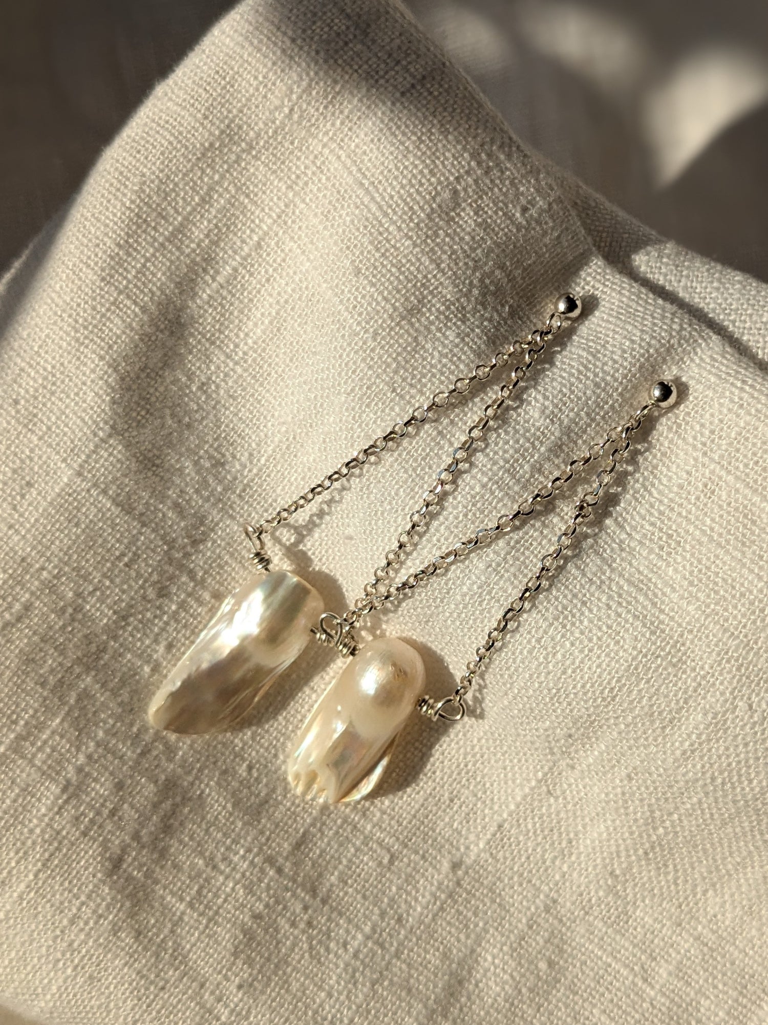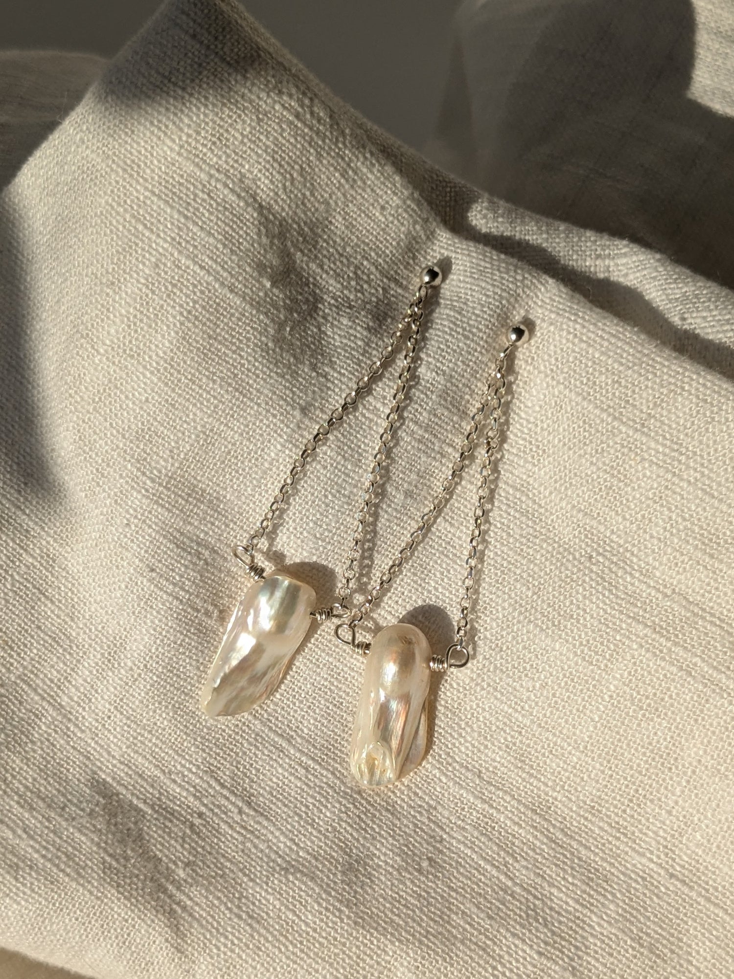 Our wonky pearls make the perfect drop earrings if you are looking for something quirky yet classic. Using reclaimed ivory irregular shaped baroque freshwater pearls (that's a mouthful!) we combined these reclaimed pearls with chain off cuts to minimize our waste. The chains will vary slightly in length from pair to pair.